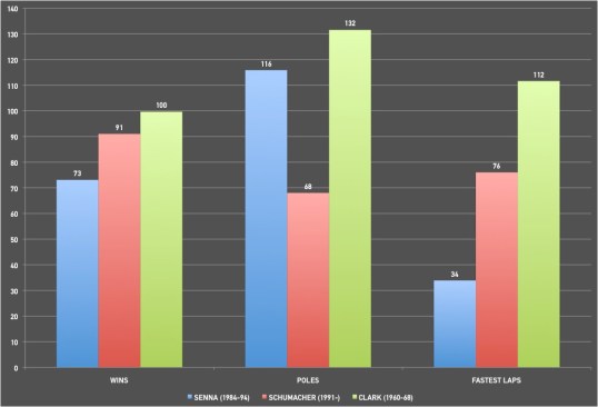 Sean Kelly – @virtualstatman – produced an amazing suite of graphics for Ep 62 of The Flying Lap yesterday. (To see a re-run of the show, click the TFL icon in the column on the right here or go to http://smibs.tv/live.) One of my favourites was this – his vision of what would have happened if Ayrton Senna and Jim Clark had not been cut down in their primes but instead had continued to win at the rate that had characterised their careers from the outset. Ayrton’s blue, Michael Schumacher is red (and currently at 2012, of course); and Jim Clark is lime green. Oh, and by the way: that’s Jim in the header picture above (at Monaco, 1966, in the Lotus 33B-Climax).