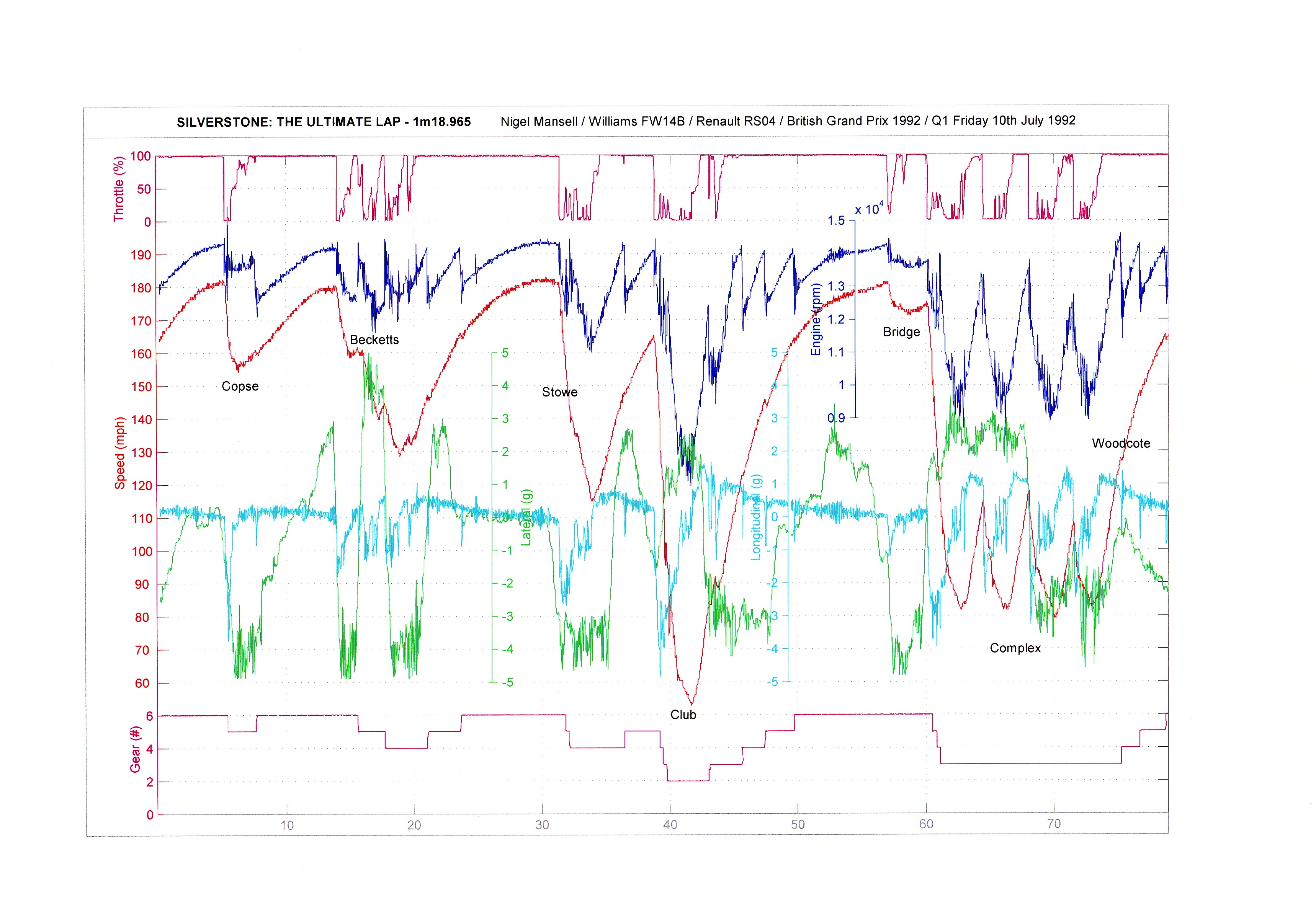 Captions, from top: Frank in relaxed mode at the pre-British GP press day – Silverstone, 1979; cockpit of the immaculate Frank Williams Racing Cars Brabham BT26 (driver, Piers Courage); back end of the Williams FW06. Hallmark of the car was great traction; sheer speed oozed from the Williams FW07 – even when it was stationary; by 1985 Nigel Mansell was quite happy to race audaciously with Ayrton Senna – and with his team-mate, Keke Rosberg; sidepod/chassis interface on the FW10. This was the first full-carbon Williams. Unlike John Barnard, who pioneered the material at McLaren, Patrick opted for a female-mould carbon chassis. It worked beautifully; We had to think hard about how to blend the combined colours of Canon, Mobil, Honda, ICI and Denim in 1985-86-87. In the end, I sketched a dark blue, angled dividing stripe front-to-rear and gave the sponsors their own territory. Frank didn’t like it at first but quickly it grew on him – particularly the shade of dark (Mobil) blue! I still love that livery…; I was lucky enough to represent the team on various podii in 1991/92. Nigel, Riccardo, Ayrton and I had plenty of laughs in “the Green room”; Paddy Lowe printed this telemetry read-out after the 1992 British GP, fittingly naming it “The Ultimate Lap”; not the Jones days: a rather subdued Patrick Head with Juan-Pablo Montoya after their win at Monaco in 2003; below – one of the key men behind the success of Williams was Frank’s Mini-racing friend from the 1960s, Sheridan Thynne (centre, chatting to Nigel and Rosanne Mansell); 1979 earth-shakers (from left to right): team manager Jeff Hazel, Charlie Chrichton-Stuart (talented F3 driver and another of Frank’s great mates from the early days), Wayne Eckersley (Australian No1 mechanic to Alan Jones) and Frank; Frank today with a background he would love: an F1 “flyaway” packhorse Images: Peter Windsor Collection, LAT Photographic