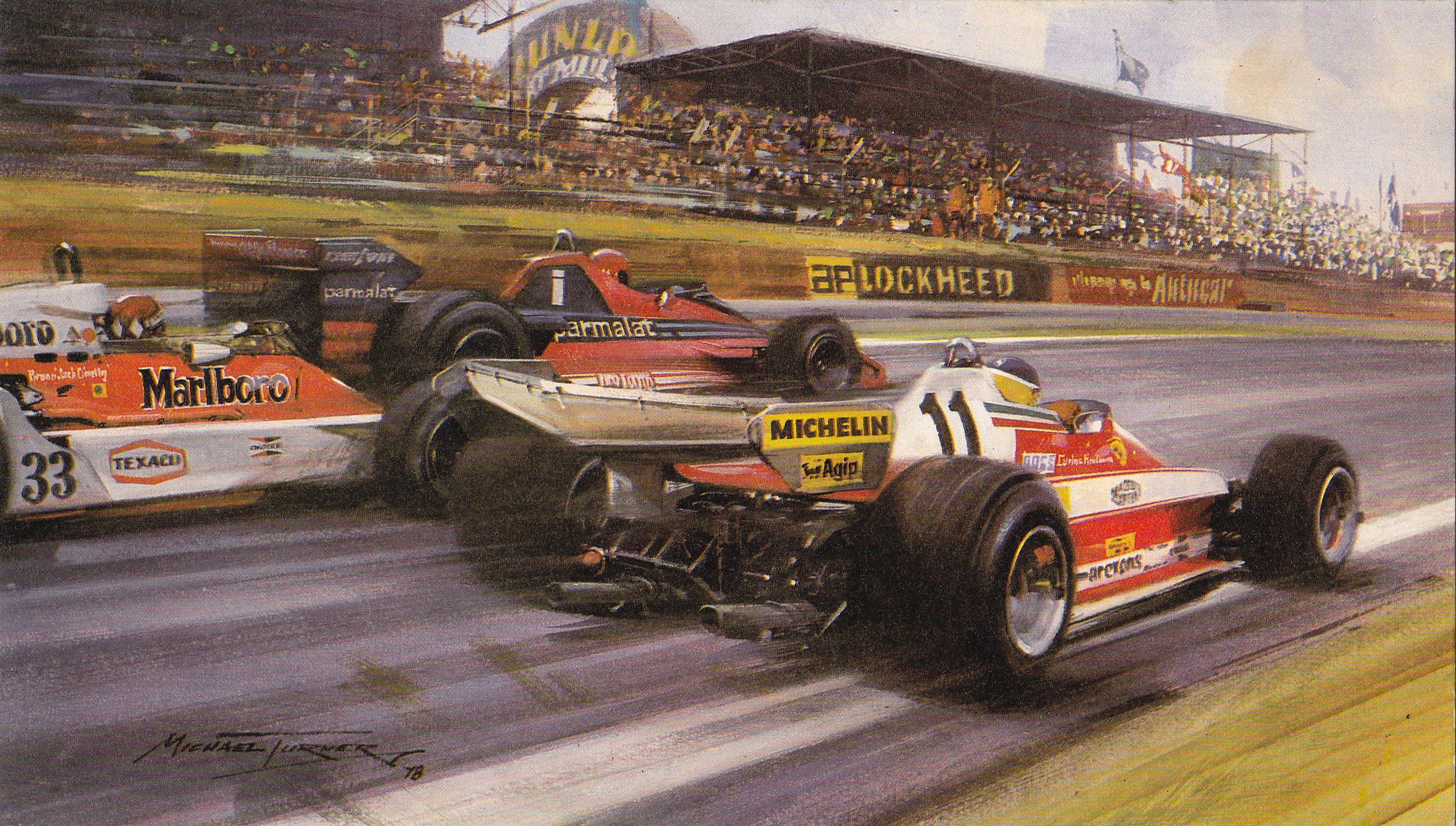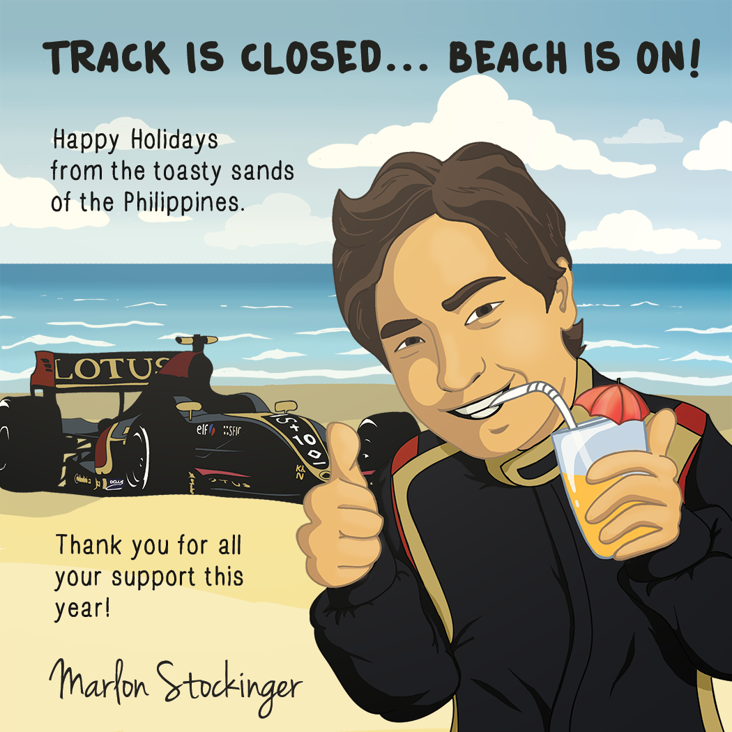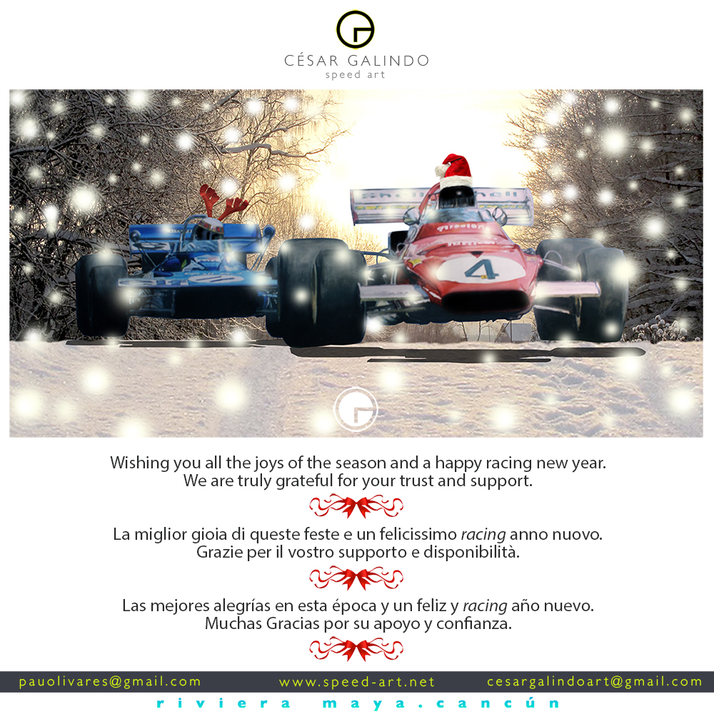 Time was when the publication of the latest collection of Michael Turner Christmas cards signalled the genuine arrival of Christmas. F1 teams featured in his work would order personalised copies by the hundreds; and we, the fans, would send Turner cards only to very special friends or family members. They were collectors’ items; you never really wanted to part with them. Now it’s different. Now, I hear, we don’t send “physical” cards any more (except in the UK, which remains the world’s leading card-sending country.) Instead, we generally do e-cards. Some (like McLaren’s) are lavish and require a fairly intricate process of download; some, like (like Mercedes-Benz Motorsport’s) are strikingly simple. Here’s a sample of some of this year’s e-cards together with a few real ones from the past that still stand the test of time. From the top: a nice mixture of Tilke and firewords from Grand Prix Photo; SpeedArt.net opt for Jacky Ickx and Jackie Stewart in the snow at the Nurburgring; David Tremayne’s excellent Stay Gold land speed record attempt dominates his Christmas message; DTM always have plenty of fireworks; the UK’s MSA is tastefully neat; Dan Gurney and the AAR team always have a laugh; Junior Lotus F1 driver, Marlon Stockinger, enjoys reminding us that he’s well away from Europe’s winter; the GTO Ferrari Club entices us to get out there in the snow; Derek Daly, former F1 driver (and father of Conor) passes on a nice Irish message for us; and Mercedes-Benz Motorsport’s e-card is, well, strikingly simple, as I say. Carlos Reutemann’s Michael Turner card of 1978 captures the moment when he seized the lead of the British GP from Niki Lauda; Jochen Rindt commissioned his own cartoon to celebrate his win in the 1969 USGP (at that point the richest race in F1 history!); Jack Brabham’s Michael Turner card reminded us of who really won the 1970 British GP; and Michael Turner himself chose one of his own BOAC 500 cards (Chris Amon in the Ferrari) to remind us, as he says, of British weather. Thanks to everyone for their best wishes. A very Happy Christmas to you all and best wishes for a safe and prosperous 2014. And, Jenson and Mark, thanks for the real card. Much appreciated.