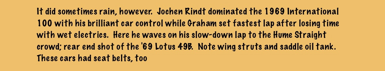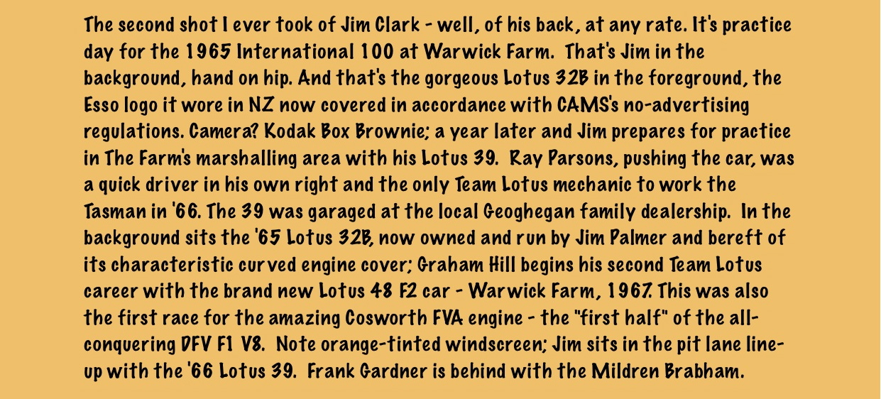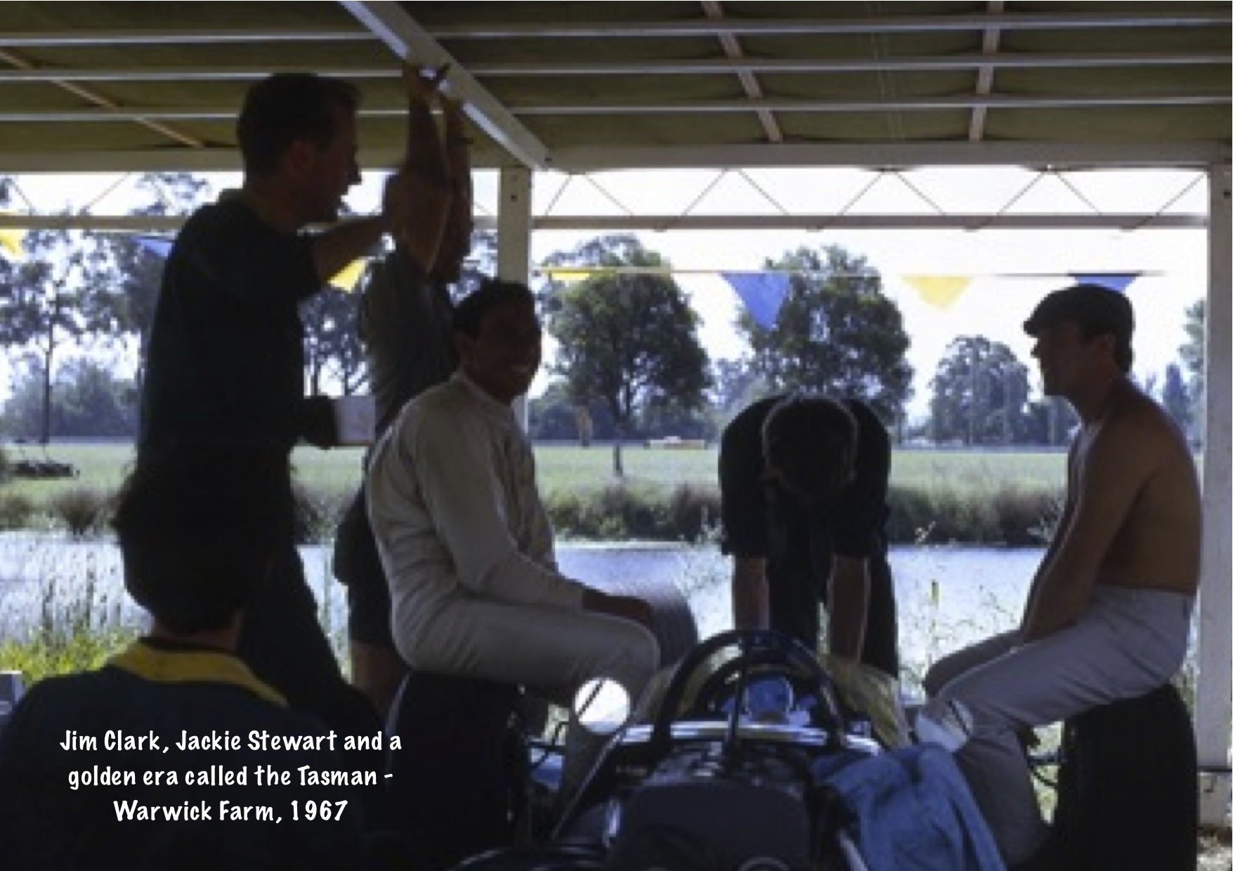 If it’s January it must be Tasman Time – with a little bit of SCG as well, of course. There was no motor racing on TV back then, so names like “Pukekohe”, “Levin”, “Wigram”, “Teretonga”, “Lakeside”, Sandown Park” and “Longford” represented just romantic slices of my imagination. Through a crackly radio, if I was lucky, I’d hear the exhilarating words: “And this afternoon’s race, run in torrid, sweltering conditions, was won by The Flying Scotsman, Jim Clark….” Warwick Farm, near Sydney, as you probably know, was my home race. Naturally I always thought of it as the jewel in the Tasman crown – and I don’t think I was wrong, as it happened, given the layout of the circuit and the silky-smooth organization of the AARC. I’d almost die with excitement as the Farm’s Tasman week approached. Jim Clark, Jackie Stewart, Graham Hill, Denny Hulme, Jack Brabham…all in my home town!