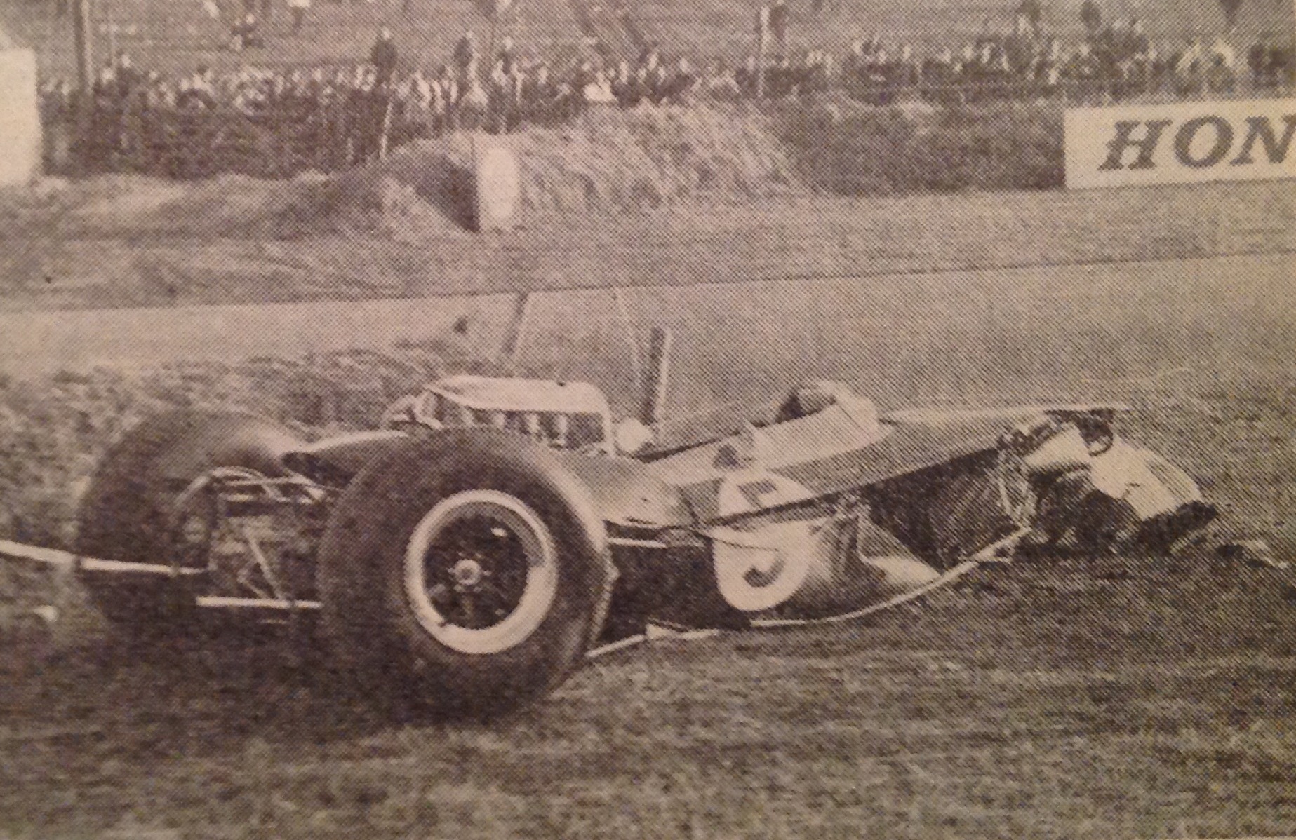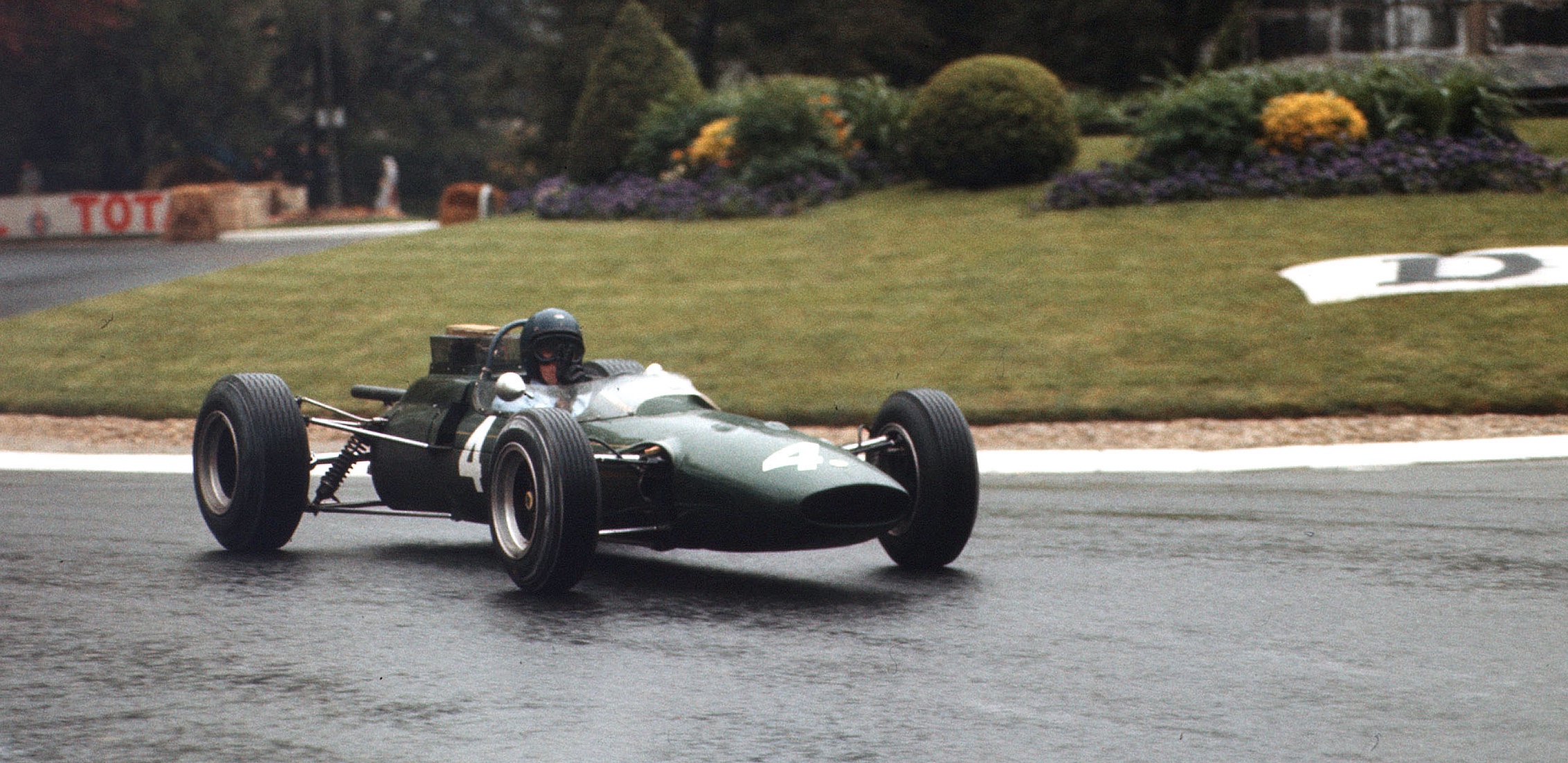 Jim passes Denny Hulme’s shunted Brabham en route to victory at Pau (for the fourth time in his career). Note kerb-scuffed right-front Dunlop R6