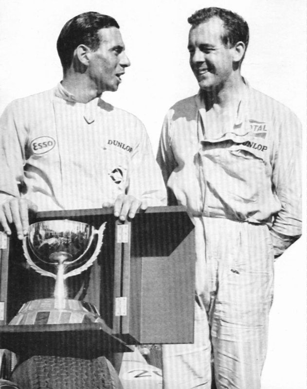 There was little time for celebration, for next on the programme was the Sussex Trophy for GT cars. The very quick Roger Mac won this outright with his Cobra, ahead of Sears (also in a Cobra) and Peter Sutcliffe’s Ferrari GTO. Jim’s friend and Tasman partner, Ray Parsons, won his class in his lightweight Elan – egged on by Jim’s pit signals from the pits.