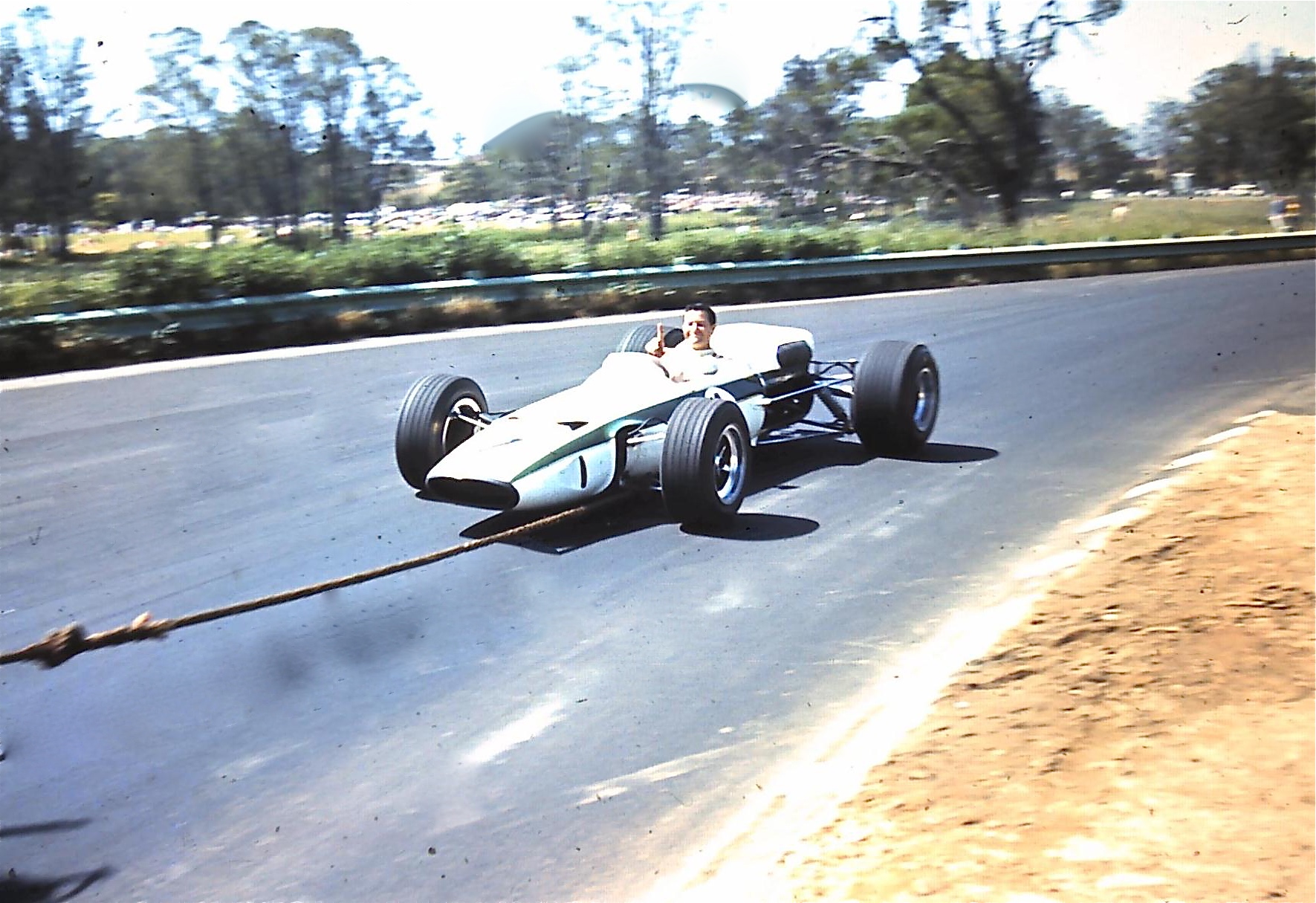 I watched him win a GT race at Bathurst with that white Lotus Elite. Somehow around that rise and fall of 170 metres per lap he and his 1220cc-engined car managed to finish ahead of Bryan Thompson in a supercharged 2.4 litre Holden-engine Prad. I also heard him crunch a gear change on his slow down lap!