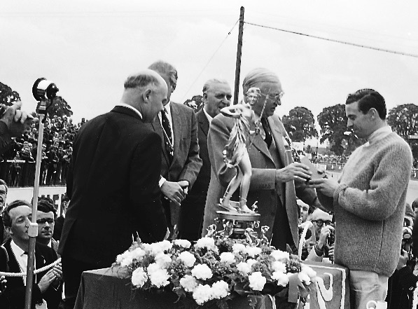 The trophy presentation takes place on the float. Dean Delamont of the RAC (left) and the Hon Gerald Lascelles assist with the honours
