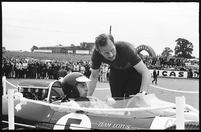 Now up on the float behind the tractor, Jim explains to Colin Chapman what transpired in the closing laps