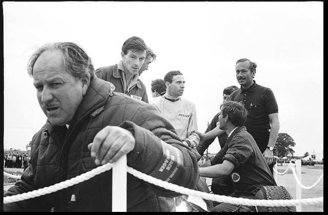 Silverstone’s Jimmy Brown – a fellow Scot – looks a little worried about the crowds that are now streaming onto the pit straight. Dick Scammell (below right) chats to Jim and Colin