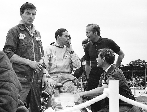 Dougie Bridge (left) looks thoughtful. Note Jim Endruweit’s pullover already on Jim’s lap