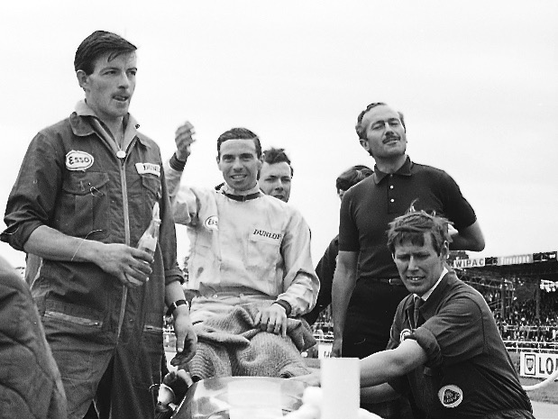 Jim waves to the crowd before donning the pullover. From left to right: Dougie Bridge, Jim, Willie Cowe, Leo Wybrott, Colin Chapman and Dick Scammell