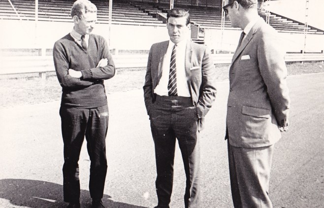 Jim talks motor racing at Ingliston. Graham Gauld, who at that point was in the process of updating “Jim Clark at the Wheel”, is on Clark’s right