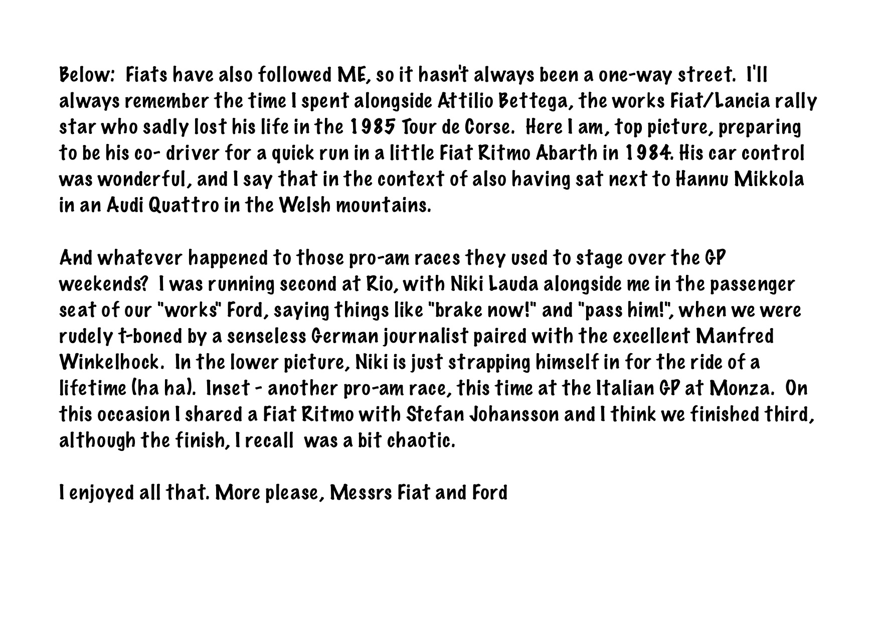 I fondly remember your Autocar articles and wonder if you had any plans to re-publish them. Ones that stand out are Michele Alboreto’s gear changing prowess, Carlos Reutemann with a FIAT 131 Mirafiori Sport at Brands, hitching a lift with Gilles and Jody in a Ferrari 400i and the little Fiat X1/9 you ran (with the Ferrari decals).