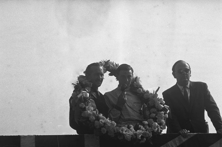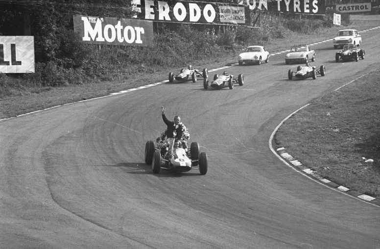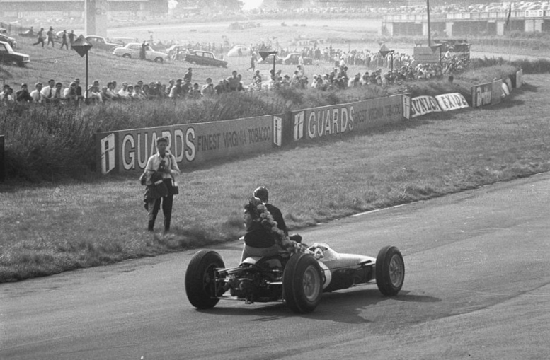 Jack, for once, ran into trouble – a punctured Firestone, to be precise. Jim was left to win from F1 arch-rival Hill – but not without incident. David Haynes demolished his Cortina GT on Bottom Straight right in front of Paddy Hopkirk’s Mini. Paddy took major avoiding action on the grass – but Jim, too, was forced to put two wheels out there on the turf to miss the melee. Fortunately, Haynes escaped uninjured.