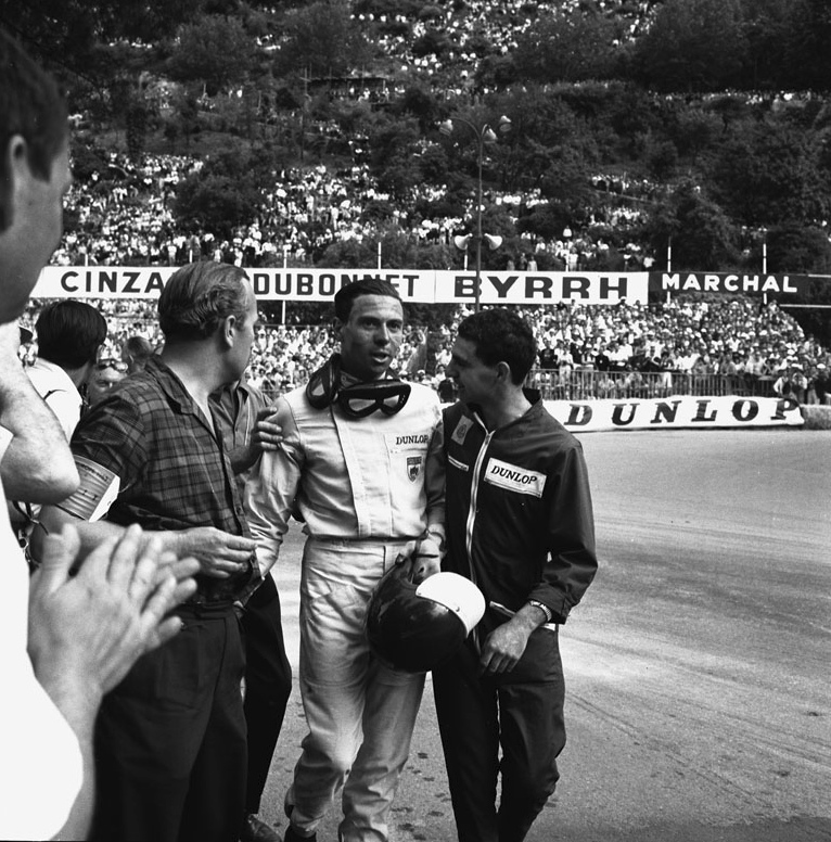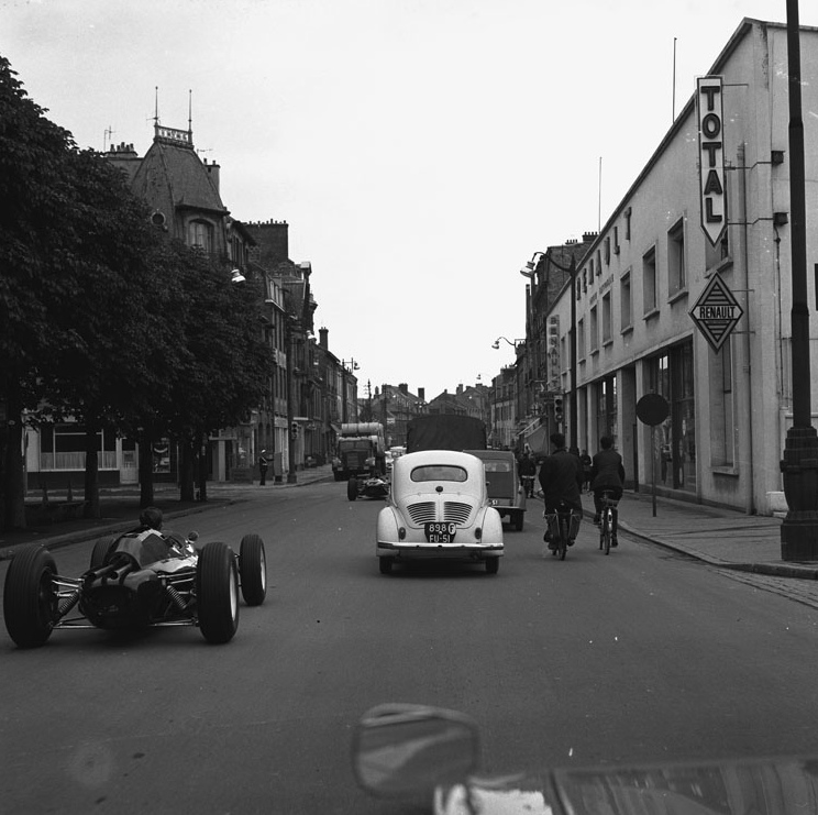 The start, as they say, was the usual shambles. A fuel vapour lock killed the engine in Graham Hill’s BRM. Push-starts were forbidden by the regulations…but “Toto Roche”, the autocratic leader of French motor sport and official starter, instructed the BRM mechanics to push Hill’s car nonetheless. The V8 now revving purely, Roche then quickly stepped away and dropped the flag – except that he dropped a red flag rather than the French national tricolor. No-one was exactly sure what to do – but they went for it nonetheless.