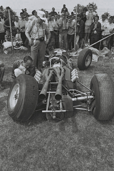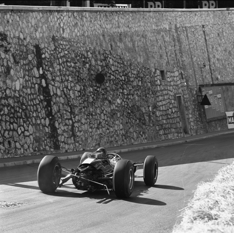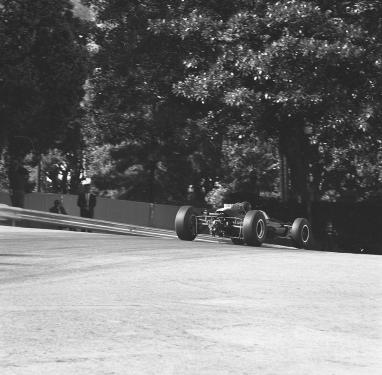 The right roll-bar mounting broke early in the Monaco GP, when Jim was pulling away from the pack with ease. Many observers believe the failure was caused on the first lap, when Jim brushed the straw bales at the fast exit of the chicane. I doubt this for two reasons: one, it was the right-hand-side that broke and, two, Jim states in the updated version of his autobiography that it was later proved back at the factory that the failure would have occurred regardless of whether he’d skimmed a wall or not. The design was subsequently modified