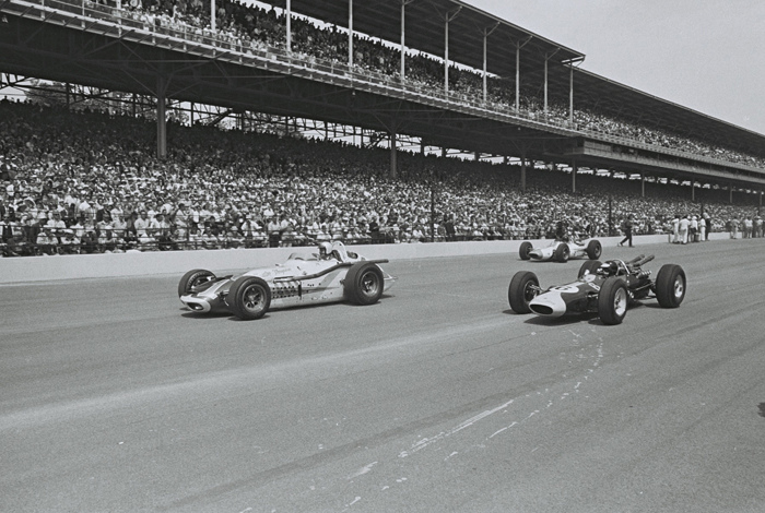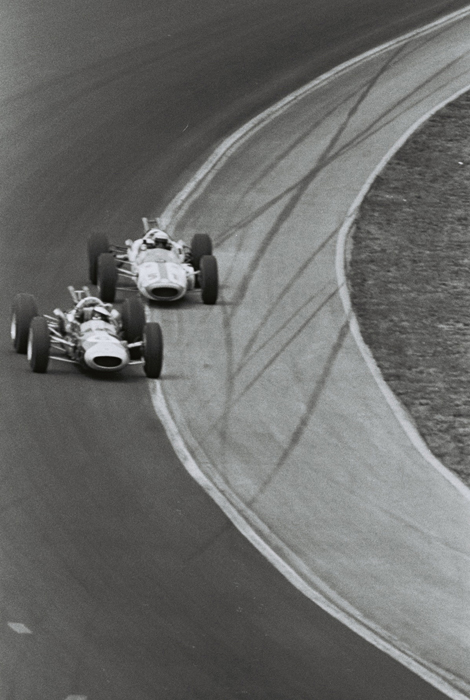 After a 90 minute delay, during which time he just sat by his car, back against a front wheel, Jim Clark again took the lead of the Indy 500. He was soon under tremendous pressure from Marshman, however – as seen here. It was Bobby’s consistently low line that settled the issue: he grounded-out the engine, causing an oil leak