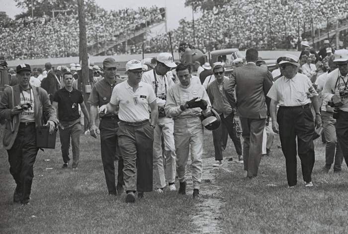 Eddie Sachs, who first raced at The Speedway in 1953, died when he tried to squeeze between MacDonald’s burning car and the outer wall. He hit the Allstate Special broadside. Both Johnny Rutherford and Jack Brabham drove through the inferno – and both had the perspicacity to accelerate onwards, using the slipstream of their cars to extinguish the flames