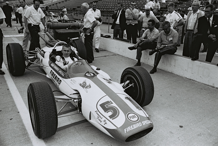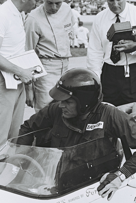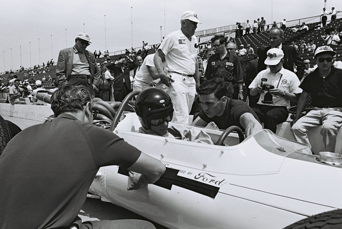 Dave MacDonald, the very talented American whom Jim knew well from the sports car series in the previous winter, qualified 14th in Mickey Thompson’s unwieldy, wide Ford rear-engined car, the Allstate Special. Its bodywork was much-altered by race day, featuring trim tabs and scoops front to rear. A glass-fibre-encased 45 gal fuel tank, containing nitro and other exotics, sat on the left of the driver