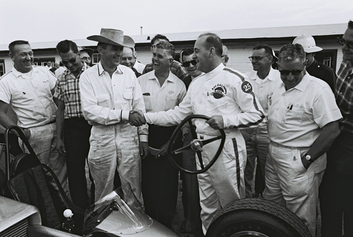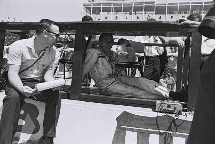 Still in casual trousers but now wearing the top half of his Dunlop overalls, Jim chats to Jack Brabham during that first day of Indy testing. Jack has just won the International Trophy at Silverstone and is running his own Offy-powered car at the Speedway. Note the asymmetric suspension and the fuel tank on the left side only