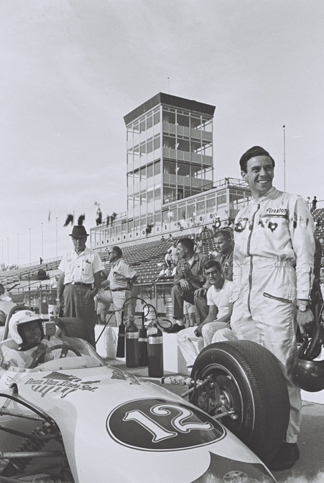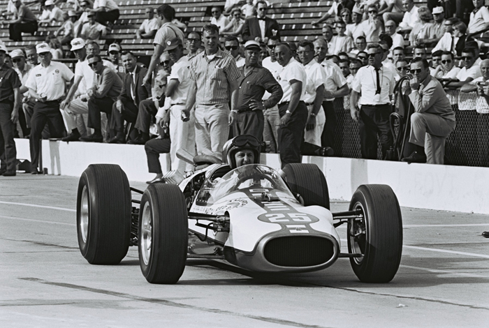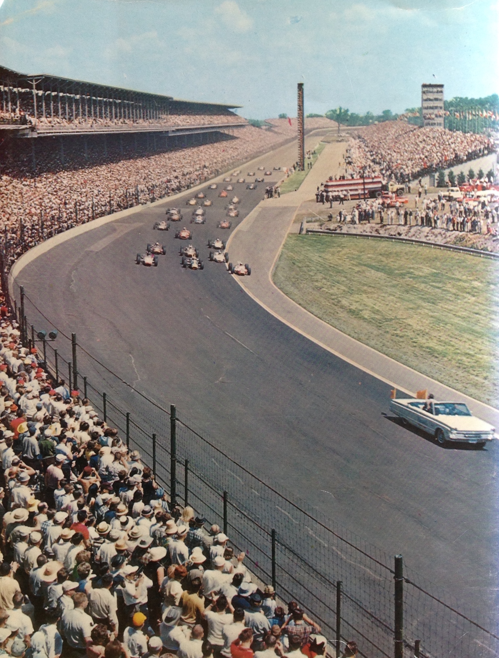 With the gentlemen having started their engines, Jim, now with white peak, sets off for the pace laps. Eventual winner, AJ Foyt, is on the left and Bobby Marshman, who qualified second is behind. It was a capacity crowd