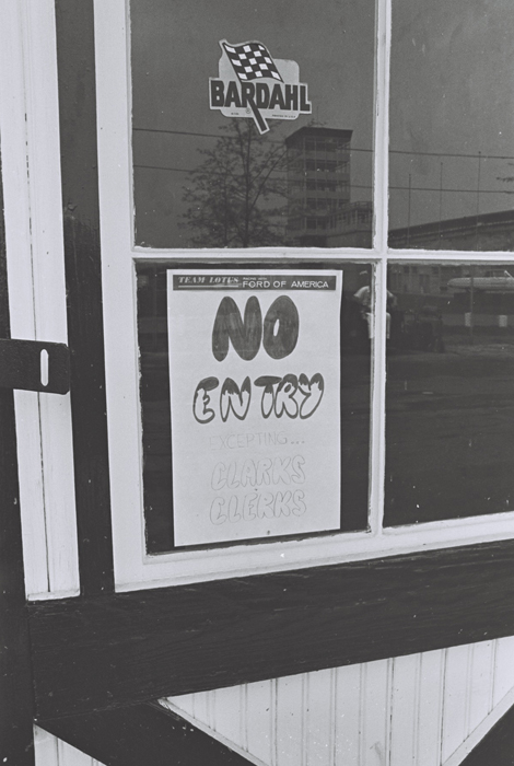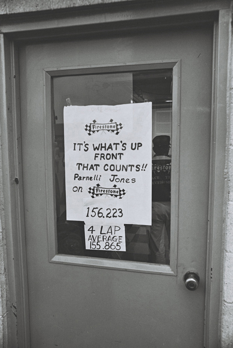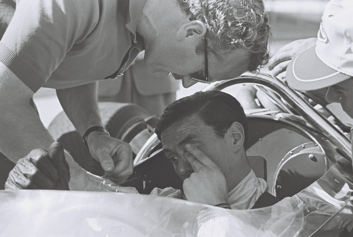 It’s now the Tuesday of the Indy tests and Jim watches as Dan lowers himself into the blue-and-white Lotus 43-Ford, windscreen now converted to “Dan-spec”. Colin, clipboard in hand, stands left and on the right, holding a pyrometer, is Dunlop’s Vic Barlow