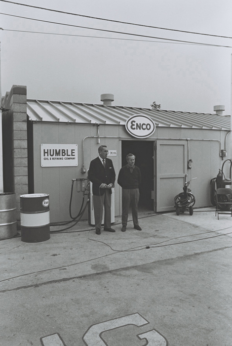Although sponsored by Pure fuel and oils in 1963, Lotus switched to the American version of Esso in 1964. Here Colin Chapman stands by the Enco (as it was known) refuelling rig in Gasoline Alley