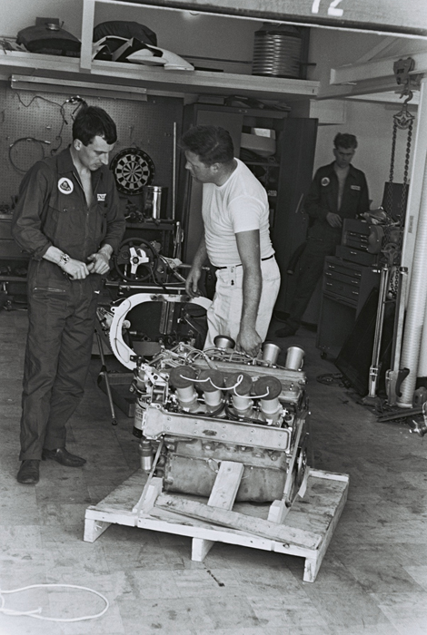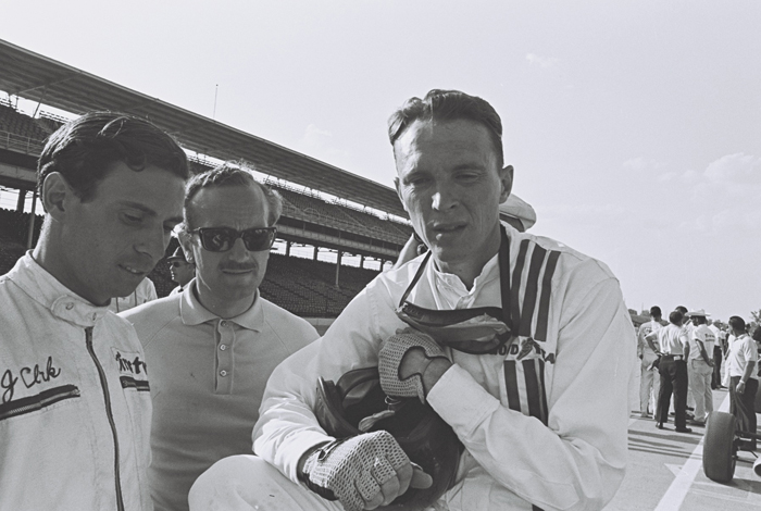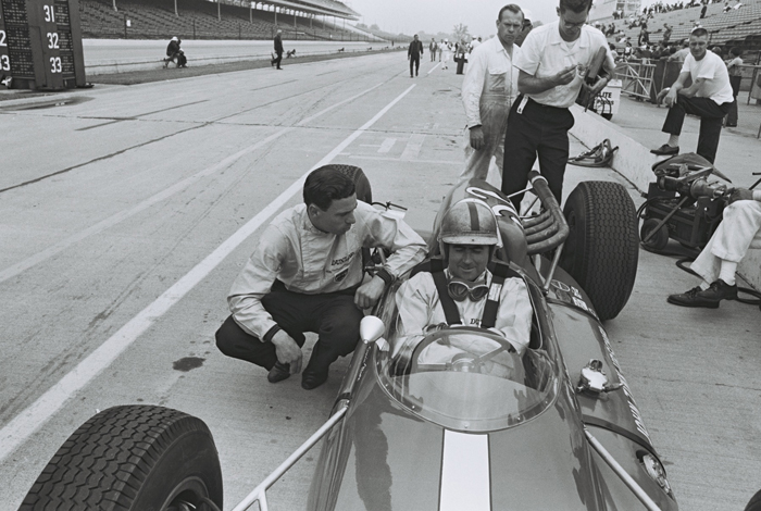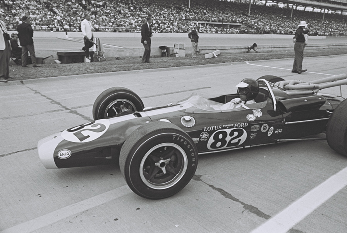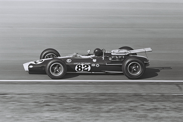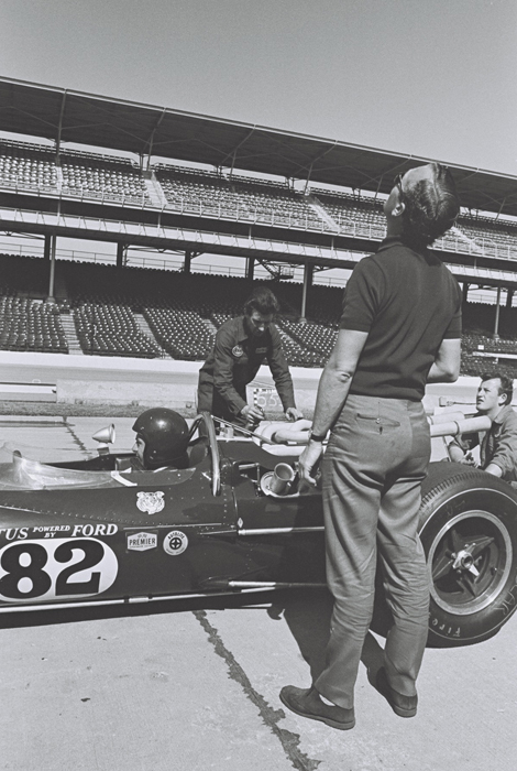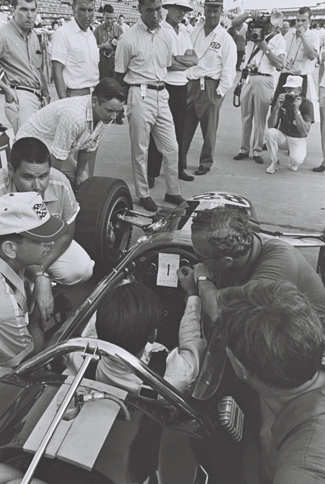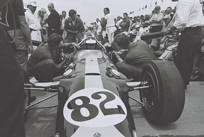 Upon arrival at Indy on the Monday after Silverstone, Jim was annoyed to find that his car wasn’t ready. He thus sat out the first day of testing, listening-in to Dan Gurney’s reports. In the foreground, Colin Chapman applies some tank tape to the 43’s bodywork joins. Note that Dan here is running Jim’s aeroscreen