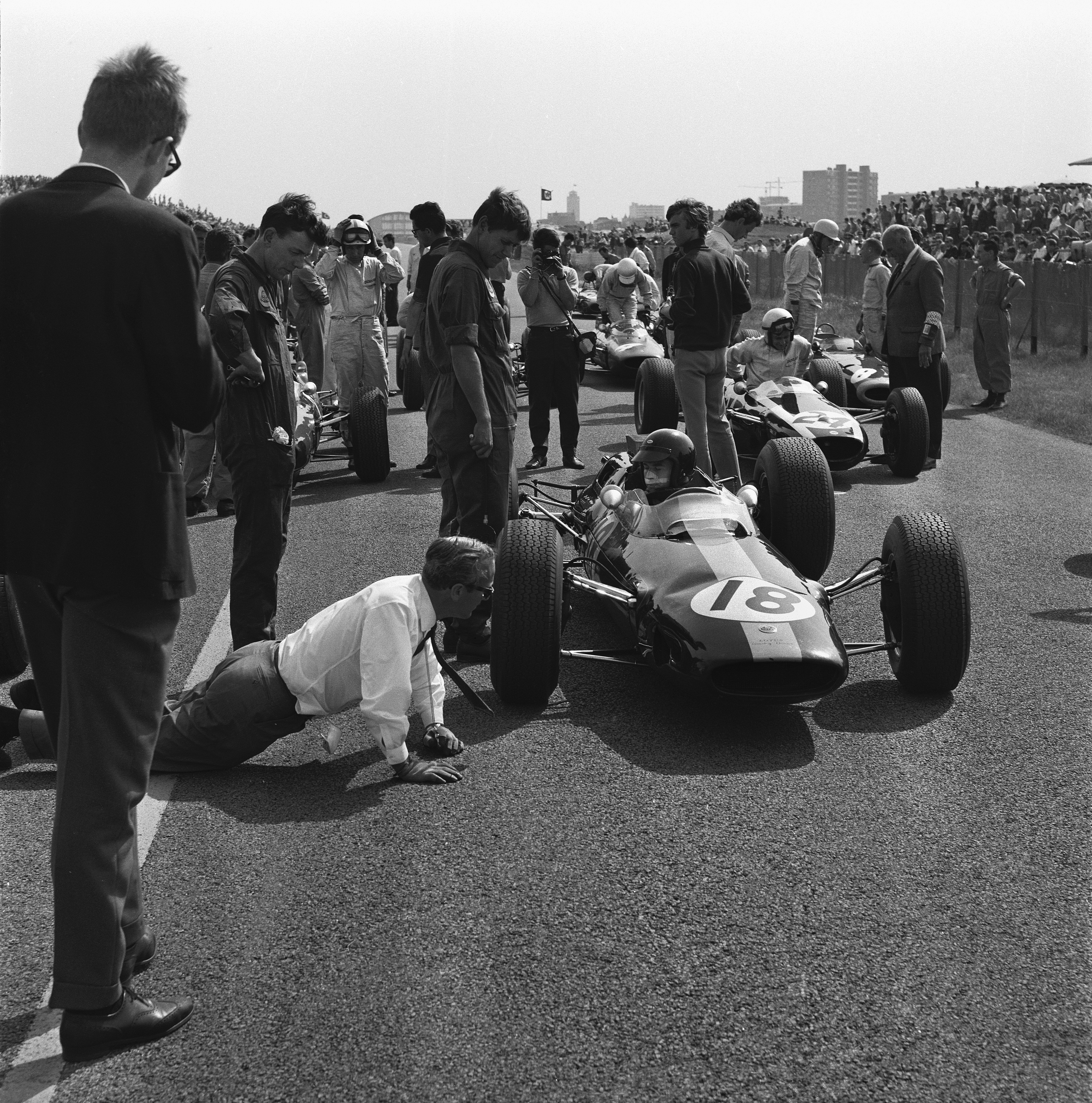 Dick Scammell checks the rear of Jim’s Lotus 25 on the Zandvoort grid while Colin gets the low-down. Behind, Bruce McLaren settles into the works Cooper while John Surtees, with Maruo Forghieri to his left, adjusts his helmet