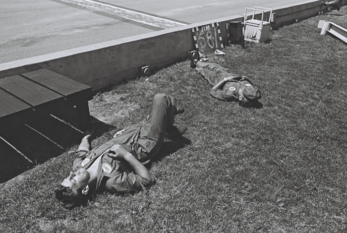 A traumatic day ends with a walk back to Gasoline Alley. Jim peels off his gloves while doing his best to accommodate well-wishers