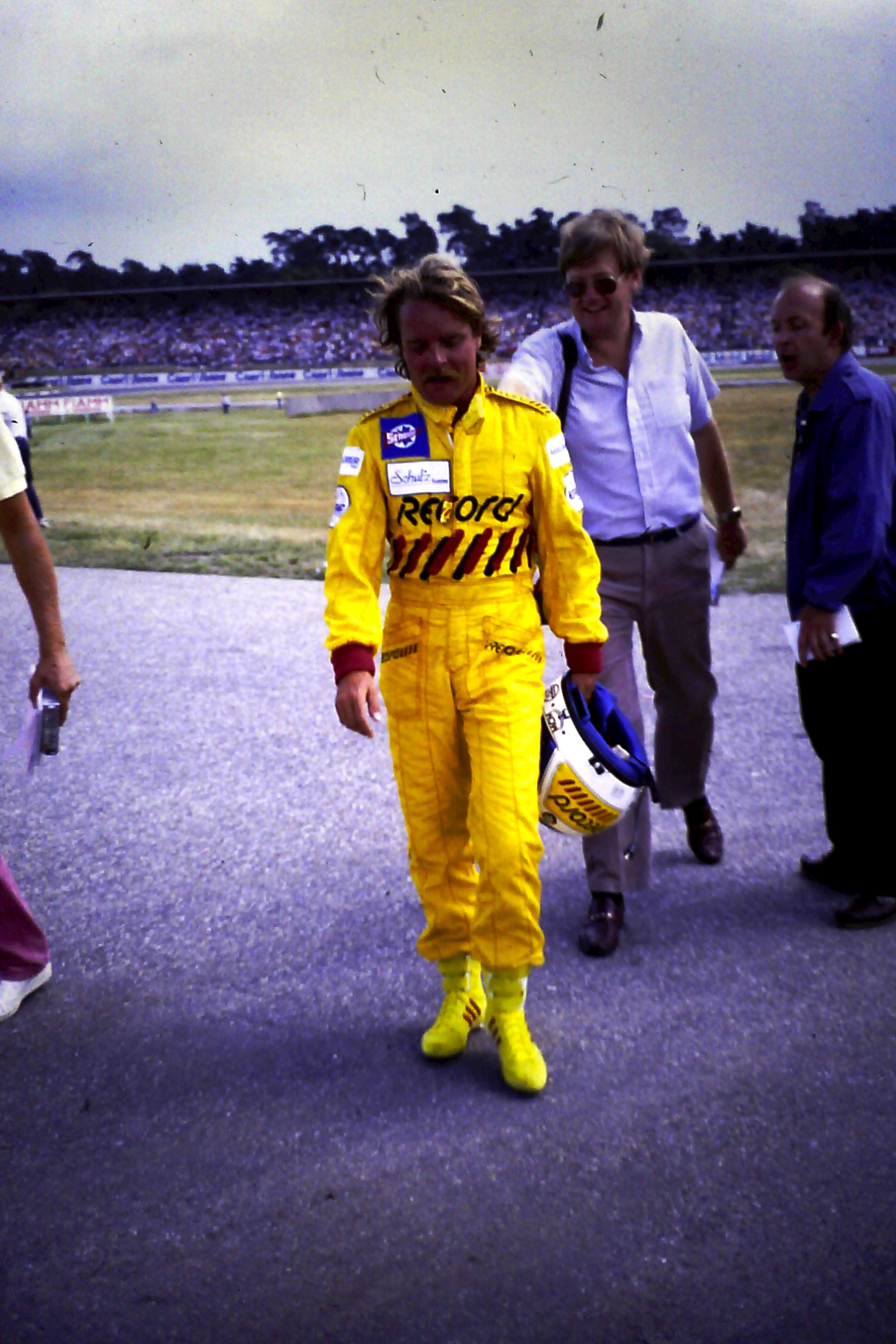 This being the week of Rosbergmania, especially in Germany, let’s have a look at Nico’s Dad, Keijo “Keke” Rosberg, in full yellow (ICI Fibres) regalia at Hockenheim, 1984. That’s Alan Henry and Nigel Roebuck in the background; both of them, to this day, remain close friends with Keke. Note Keke’s attention to detail: he was always immaculate. When he wasn’t in race kit he was usually seen either in a Hard Rock “Save the Planet” leather bomber jacket (long before the rest of the world discovered them) or with something from Etienne Aigner or MCM. Nor is it difficult to see from where Nico’s yellow colour-coding (helmet, gloves, etc) originates. Continuing the Rosberg theme, how about the shot below for good measure? I took this at the Kyalami Ranch, South Africa, also in 1984. Alain Prost’s reading L’Equipe; Nelson Piquet Jnr’s Mum, Sylvia, is walking out of picture in the red bikini; ace photojournalist, Jeff Hutchinson, is thinking about his next story for Autosport; and Nico’s Mum (also walking) and Dad can be seen to Jeff’s left.