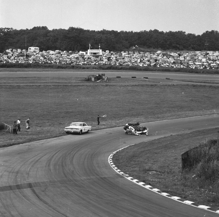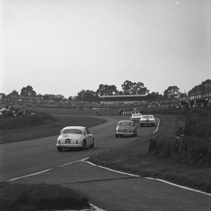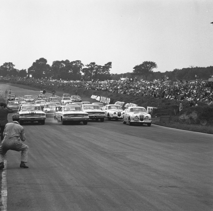 “And it’s Jim Clark in front!  Clark leads from Sears and then come the three Jaguars – Graham Hill in the Coombs car, Roy Salvadori, Mike Salmon, who banged into Sir Gawaine Baillie’s slow-starting Galaxie off the line…”