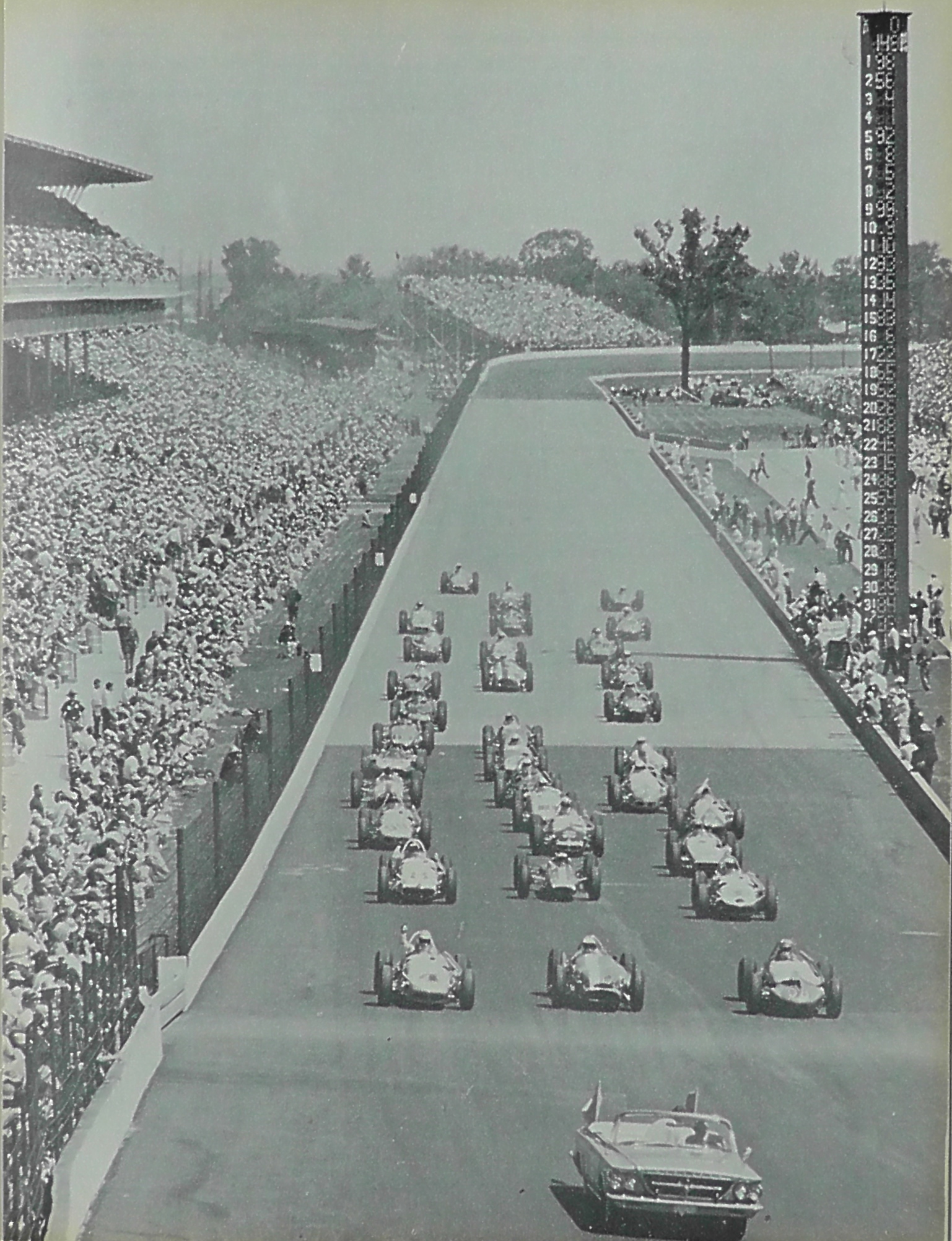 “Minutes later, Jim Clark took his turn with a flourish, provided by promoter Sam Nunis. A local bagpipe band huffed and wheezed at ‘Scotland, the Brave’ as Clark, in his green-and-yellow car, was pushed out before the cheering fans on the grandstand straight. All work stopped. Wrenches were laid aside and heads came out from beneath raised hoods. Everyone knew what was going to happen.