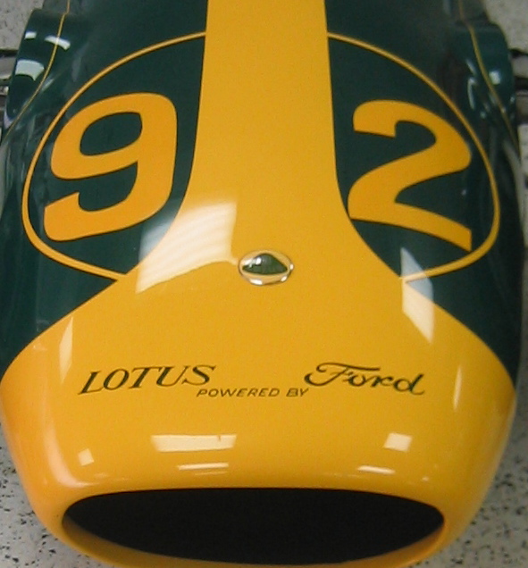 “The young Scot had pulled into the pits. A glance at his oil pressure gauge brought him in, and an ever-growing puddle of black under his car kept him in. Through for the day, the primrose-yellow-overalled driver” (the Hinchmans!) “climbed atop a nearby truck and joined Rodger Ward as a spectator. Englishman Colin Chapman, builder of the Lotus-Fords, stood by as the crew removed the engine cover, revealing a ruptured four-inch hose, used to join the chassis oil tube to the cast-aluminium ‘Fairlane’ engine. Unceremoniously, the car was shoved into its van.