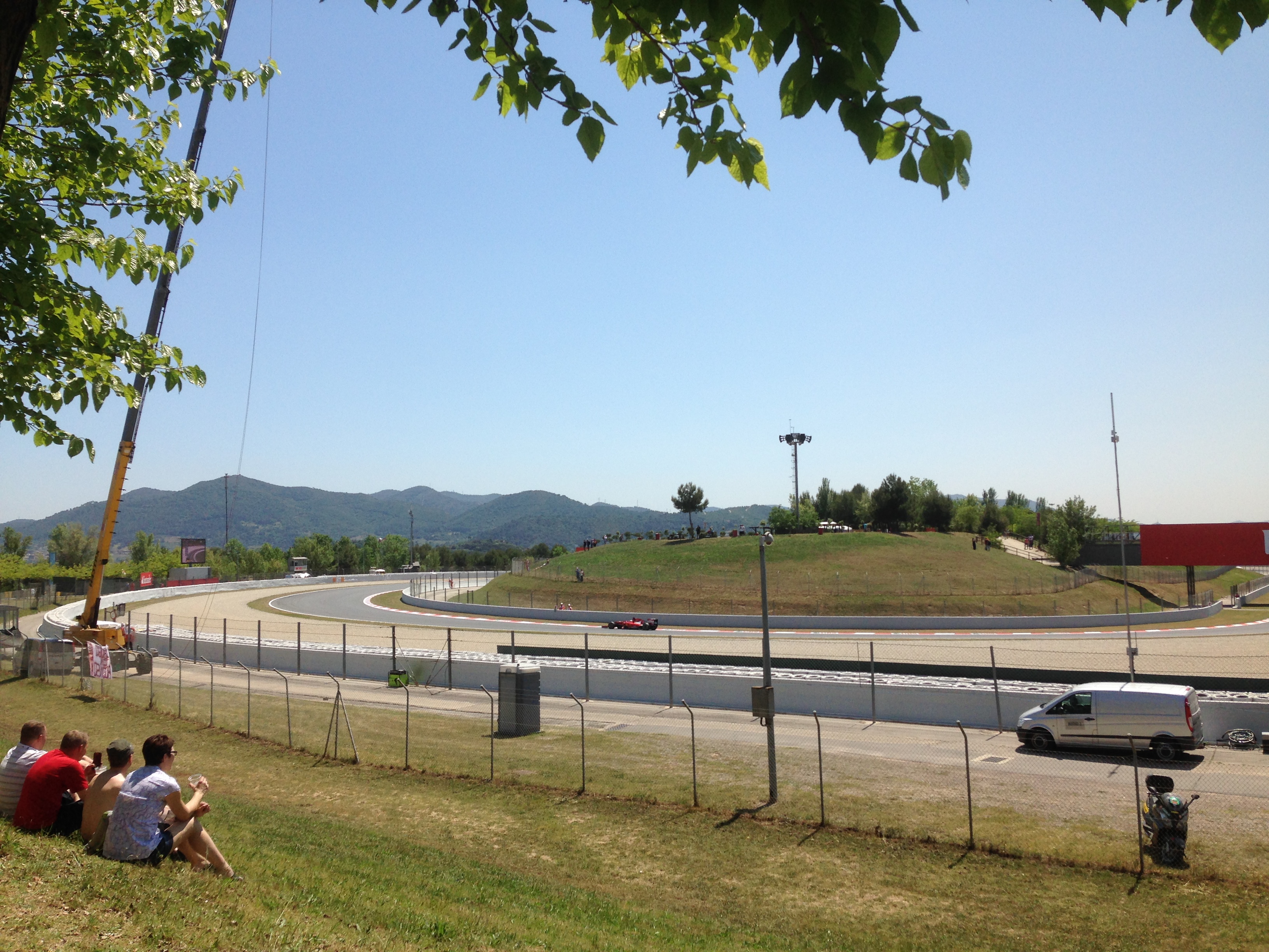 Ferrari. Red-bedecked Spaniards wave valiantly. And Fernando only once looks bad at T4. That is when he enters about 5mph too quickly, runs to the outside, tyres chirping, and then comes right out of the throttle to bring the thing back. Otherwise, he is a model of security and efficiency. There is nothing spectacular about Fernando here; there is, though, everything you need from a Ferrari driver extracting the repeatable most from his car. He vees the corner for lap after lap, extending the straight down the inside, running as if on rails to the outside, mid-corner, rotating the car with a boatload of patience and then accelerating out almost in a dead straight line. Two-thirds of the way through T4, Fernando is to the right of centre. Every other driver (with the possible exception of Sebastian Vettel, of whom we didn’t see enough) are either centre of the road (Maldonado, Massa, Perez, Hulkenberg, Ricciardo) or way out there, left of centre, accelerating hard through the gears still with massive lateral load pushing sideways through the rear tyres.