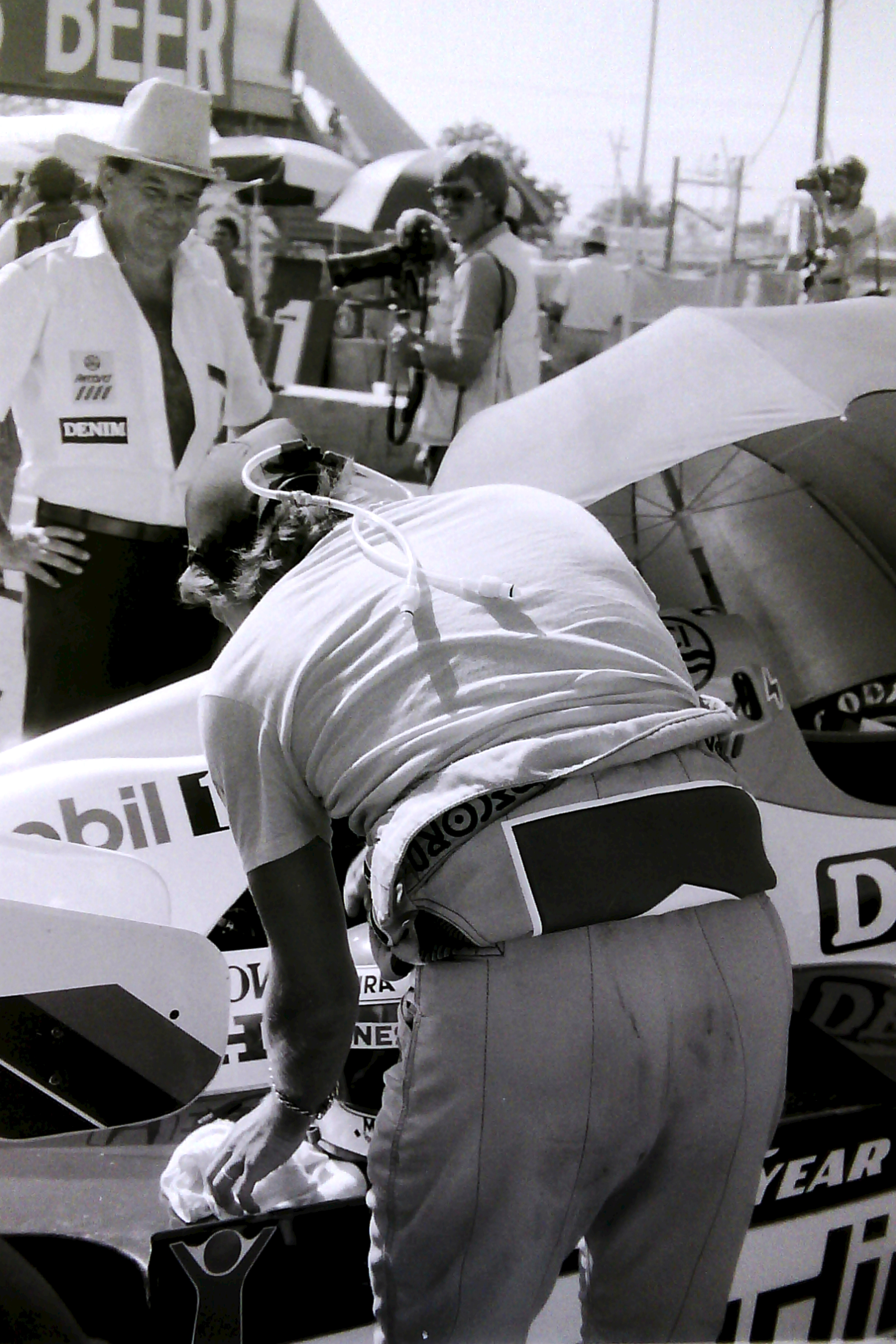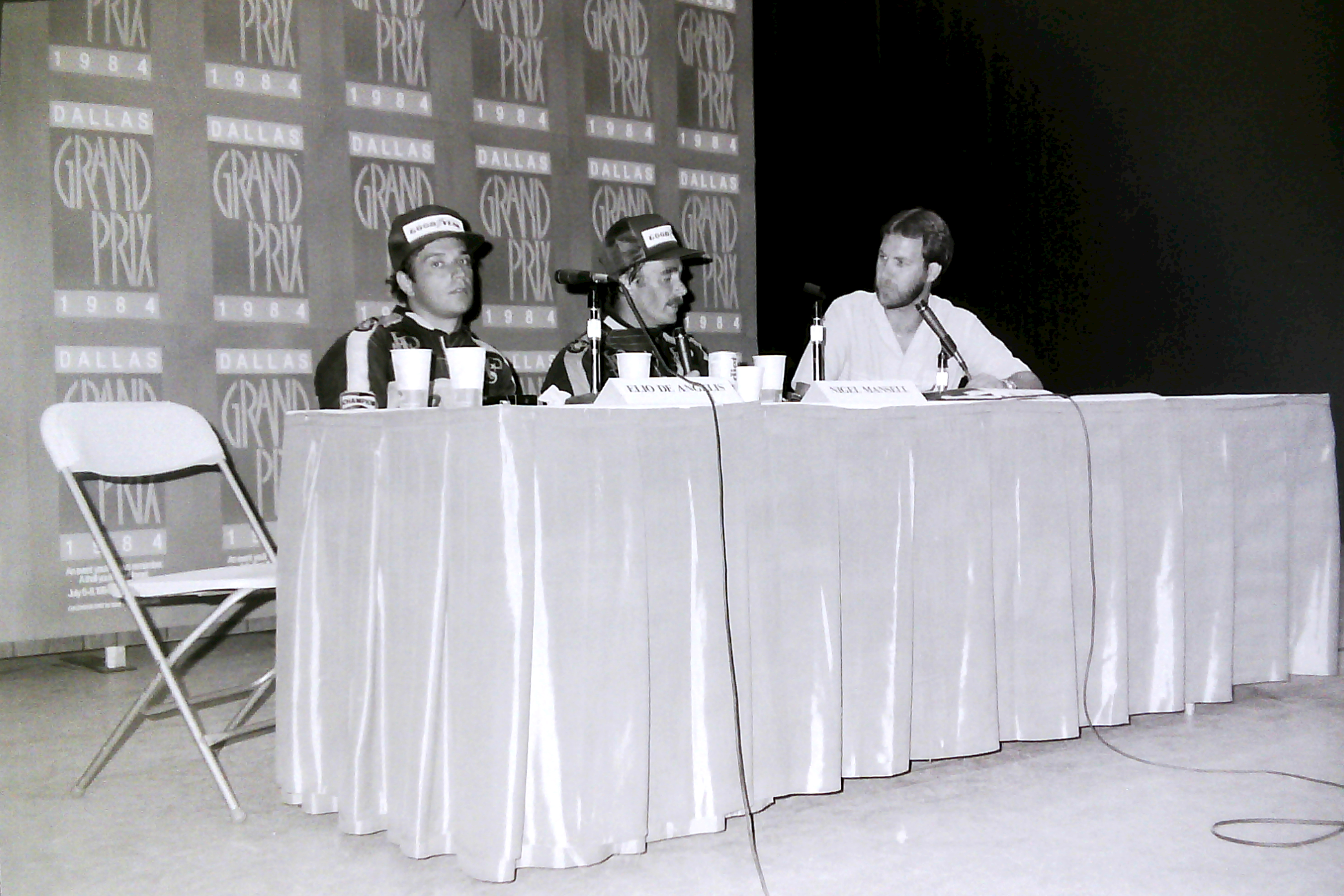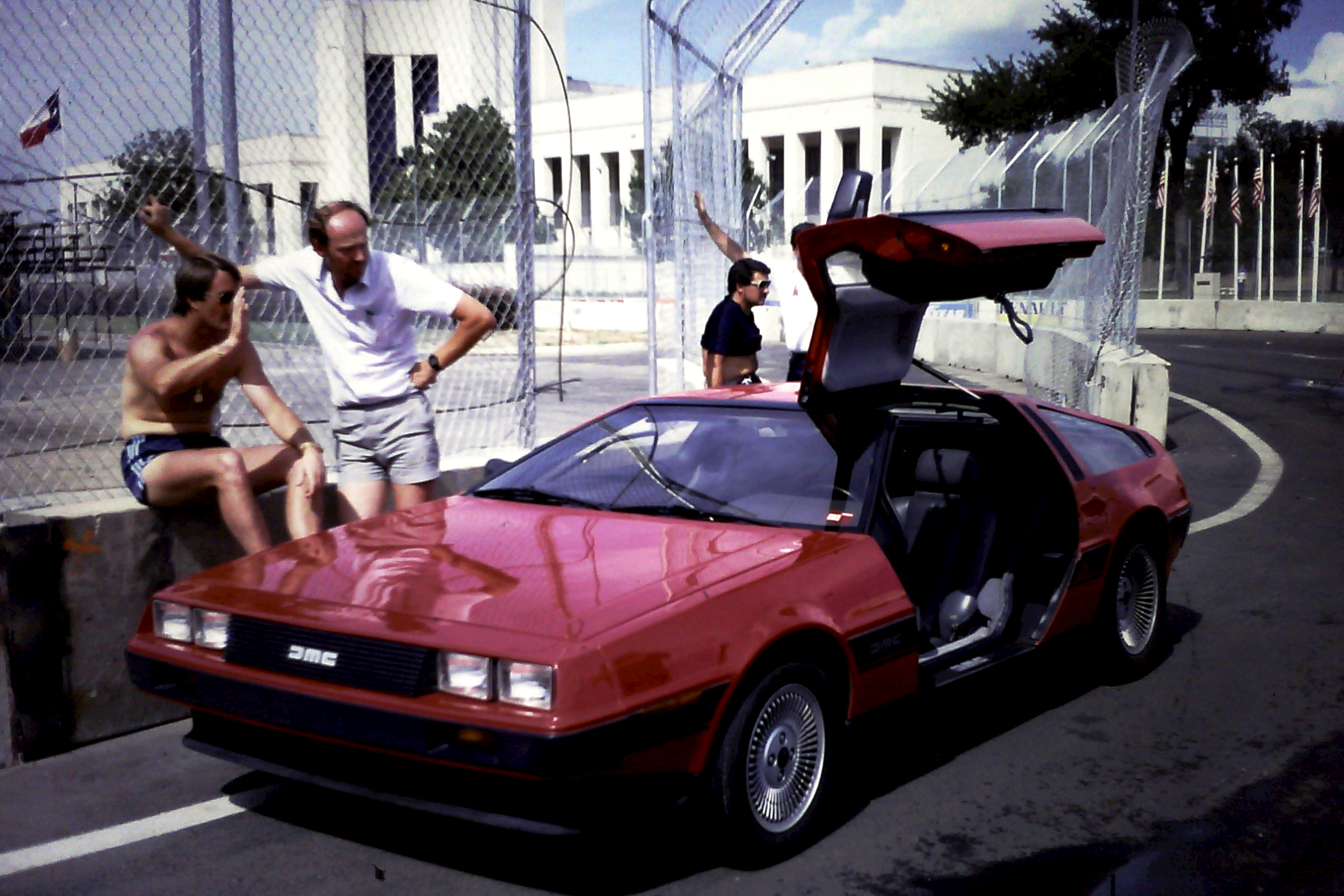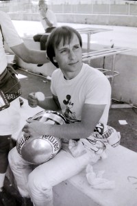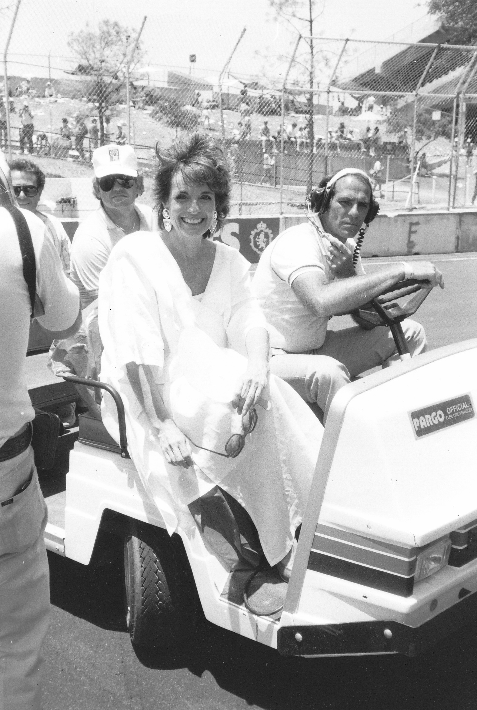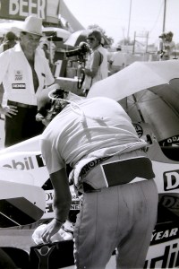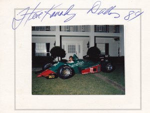 Captions, from top left: Larry Hagman – he’ll be sadly missed.  His autobiography, published recently, is a must-read; I don’t know what I enjoyed most – the Benetton party at Southfork Ranch or posing in the factory Alfa with a sweet, Texan pussycat; F1 people headed quickly for Southfork Ranch – and found that it was just as it seemed to be in the show!; the delightful Linda “Sue-Ellen Ewing” Gray was golf-buggied to the starting grid;  Tyrrell’s Martin Brundle and Steve “Ray Krebbs” Kanaly shared some laughs; Ayrton stayed characteristically cool; Niki Lauda, who would win the Championship that year (by half a point:  you think 2012 was close!), with trademark fruit (who needs a drink bottle?!); this we’d never seen before: marching girls! On an F1 grid!; Keijo Rosberg won the race for Williams-Honda, helped in large measure by the cool suit created for him by Williams Team Manager, Peter Collins. We all approved of the headgear worn by the Willy boys, as modelled in the background by Chief Mechanic, Alan Challis; Brabham’s Corrado Fabi prepares for work.  Mickey Mouse t-shirts (won under the race suit, Rene Arnoux-style) were all the rage back then; Nigel Mansell catches up with the sports news on the bus into the paddock on Saturday morning: “Lotus’ Mansell sizzles on hot track…!“; Elio De Angelis and Nigel tell the US media all about it.  Honed by the Glen, Long Beach and Detroit and to some extent Vegas, the American press fully-embraced F1 in Dallas; Below: Nigel and his JPTL  race engineer, Steve Hallam, pause for a breather by a (rare) Colin Chapman-inspired DeLorean during their pre-practice track walk; Bottom: Patrick Duffy, and (in white polo, staring at the lens) the brilliant singer/songwriter Christopher Cross  feign interest during a briefing for the celebrity race.  “If you get caught between the moon and New York City….” just about summed it all up