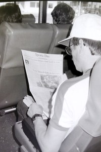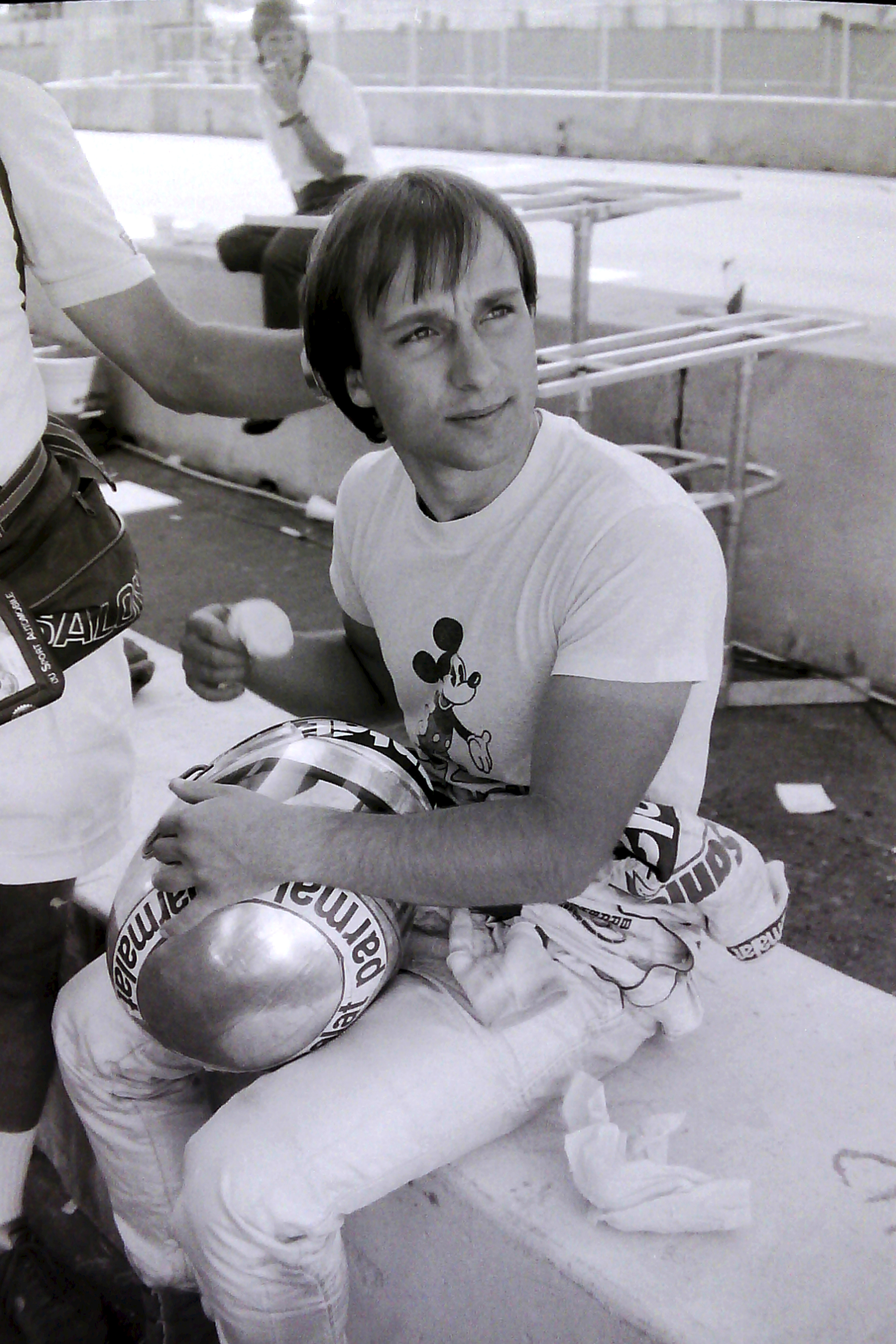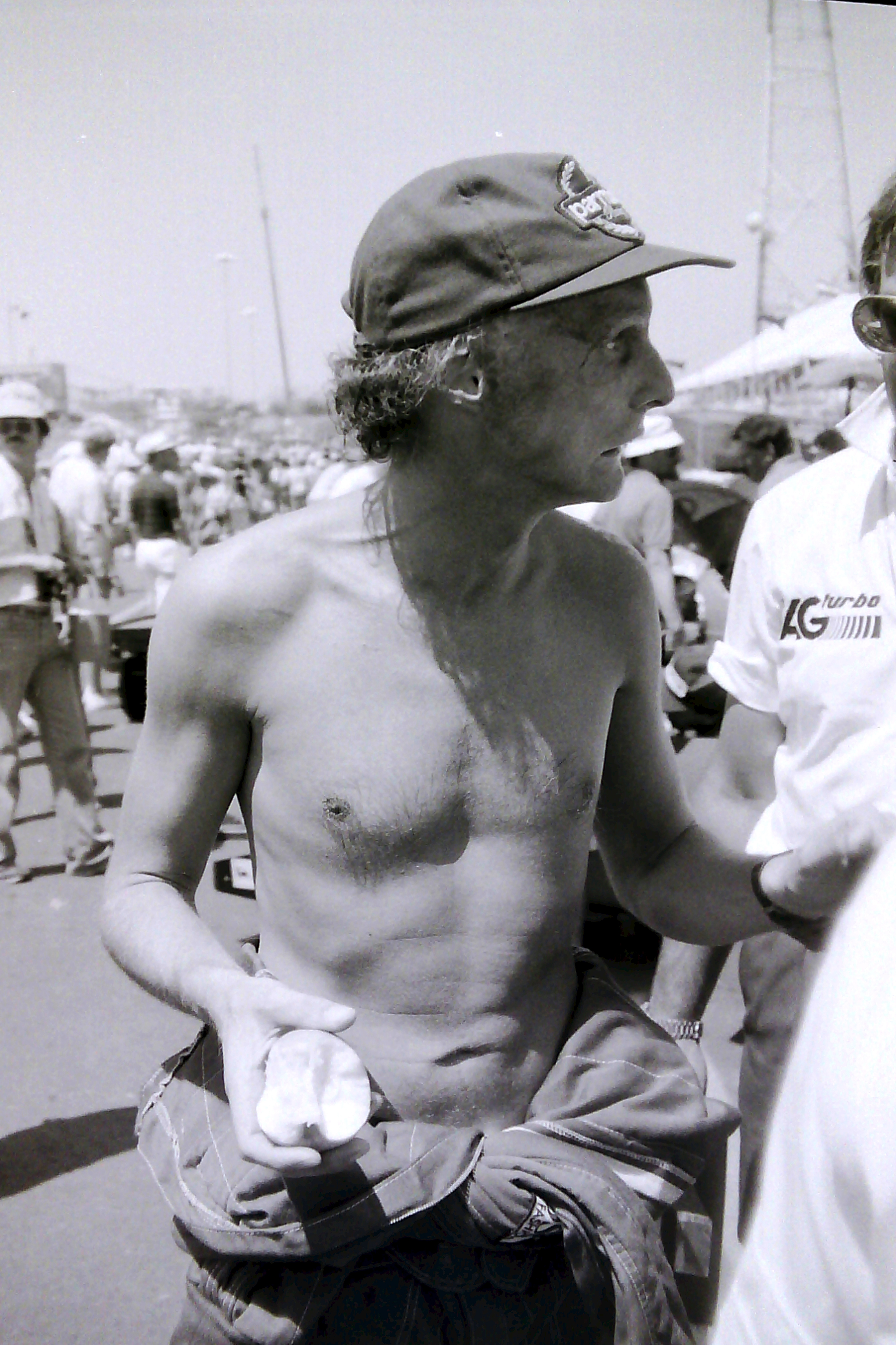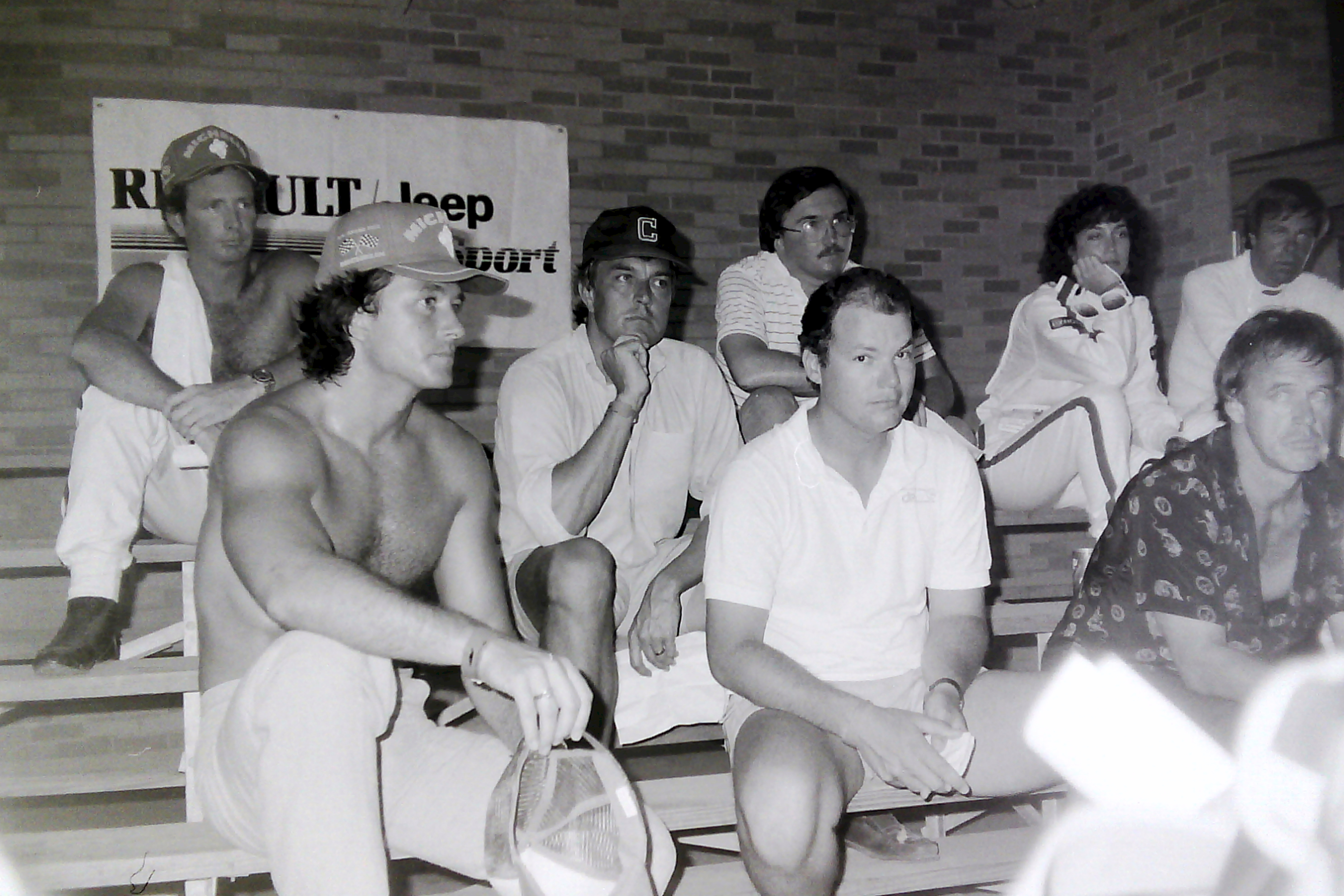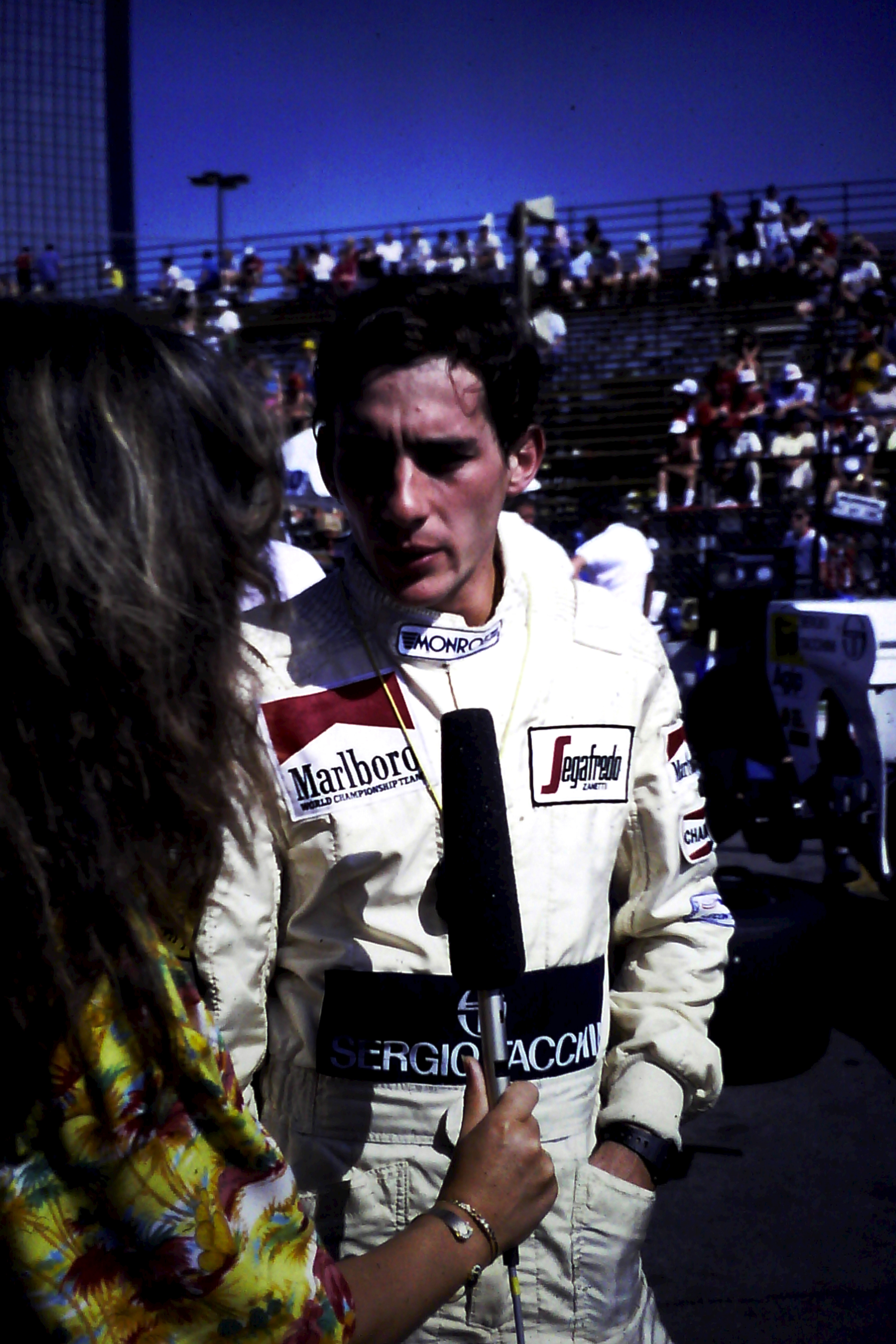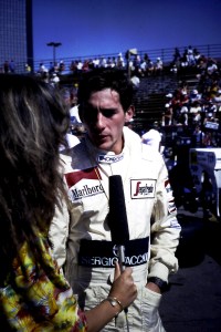 Captions, from top left: Larry Hagman – he’ll be sadly missed.  His autobiography, published recently, is a must-read; I don’t know what I enjoyed most – the Benetton party at Southfork Ranch or posing in the factory Alfa with a sweet, Texan pussycat; F1 people headed quickly for Southfork Ranch – and found that it was just as it seemed to be in the show!; the delightful Linda “Sue-Ellen Ewing” Gray was golf-buggied to the starting grid;  Tyrrell’s Martin Brundle and Steve “Ray Krebbs” Kanaly shared some laughs; Ayrton stayed characteristically cool; Niki Lauda, who would win the Championship that year (by half a point:  you think 2012 was close!), with trademark fruit (who needs a drink bottle?!); this we’d never seen before: marching girls! On an F1 grid!; Keijo Rosberg won the race for Williams-Honda, helped in large measure by the cool suit created for him by Williams Team Manager, Peter Collins. We all approved of the headgear worn by the Willy boys, as modelled in the background by Chief Mechanic, Alan Challis; Brabham’s Corrado Fabi prepares for work.  Mickey Mouse t-shirts (won under the race suit, Rene Arnoux-style) were all the rage back then; Nigel Mansell catches up with the sports news on the bus into the paddock on Saturday morning: “Lotus’ Mansell sizzles on hot track…!“; Elio De Angelis and Nigel tell the US media all about it.  Honed by the Glen, Long Beach and Detroit and to some extent Vegas, the American press fully-embraced F1 in Dallas; Below: Nigel and his JPTL  race engineer, Steve Hallam, pause for a breather by a (rare) Colin Chapman-inspired DeLorean during their pre-practice track walk; Bottom: Patrick Duffy, and (in white polo, staring at the lens) the brilliant singer/songwriter Christopher Cross  feign interest during a briefing for the celebrity race.  “If you get caught between the moon and New York City….” just about summed it all up