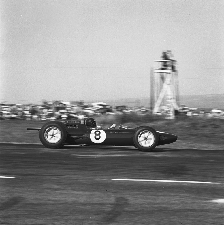 Jim, in relaxed mood, qualified second, 0.1 sec behind Graham Hill’s old space-frame BRM. Milliken also recalls in his excellent autobiography (Equations in Motion, with an introduction by Dan Gurney) that the timekeepers “always had problems with Colin Chapman. Colin timed his own entries and claimed his faster figures were correct, so Bill Close, one of our timers and a solid Scotsman, put two clocks on each Lotus…”